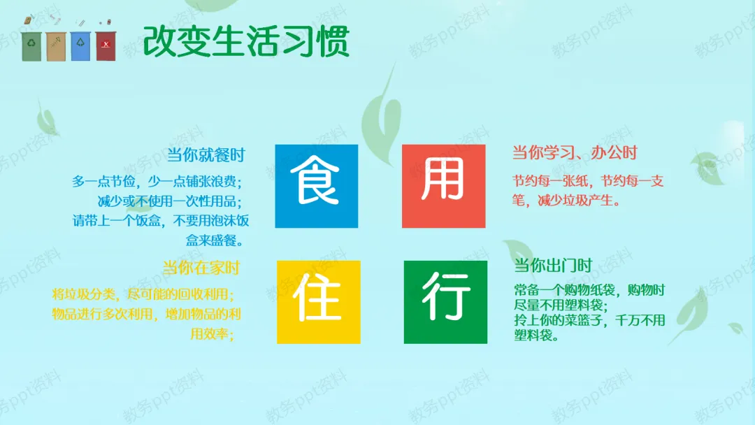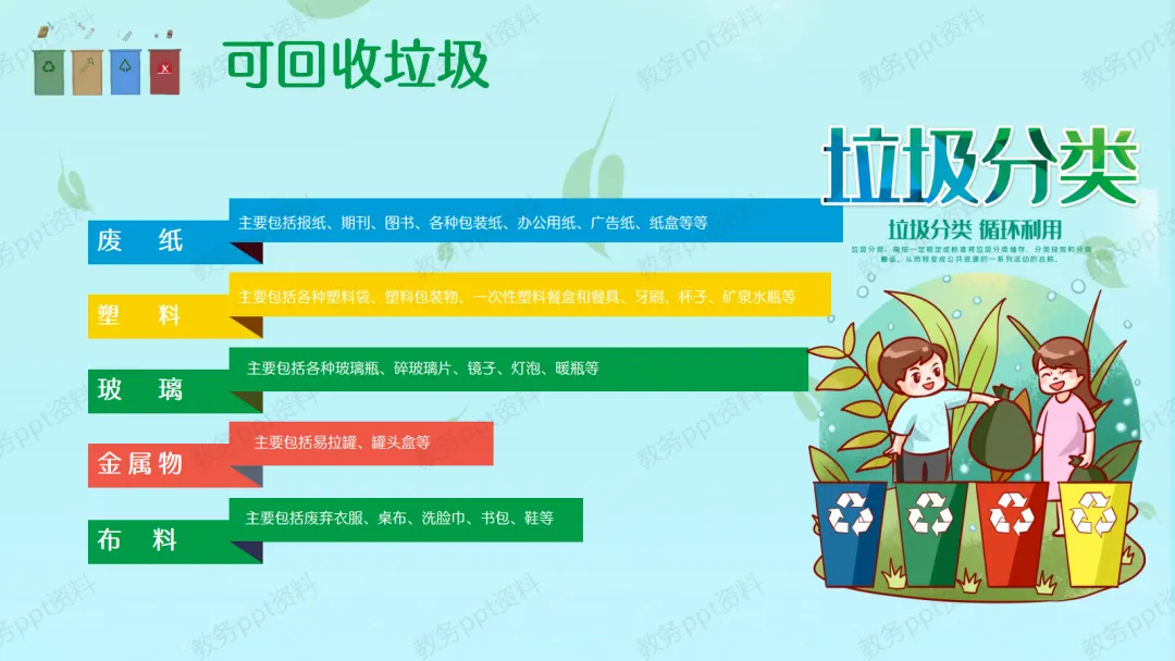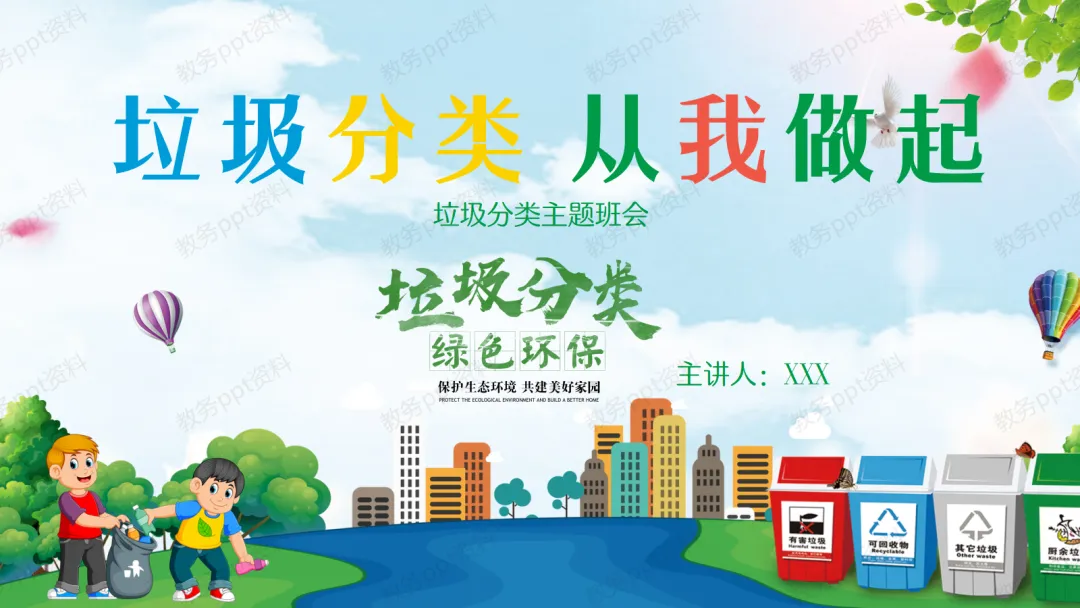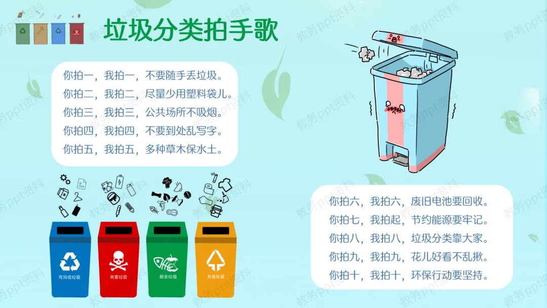 【行动号召】同学们,保护环境人人有责。我们一起来学一首好听的《垃圾分类拍手歌》,希望大家都能学会。最后,老师希望大家在日常生活中,少用一次性用品,购物自带环保袋,吃饭光盘行动。让我们从今天开始,从自己做起,做一个环保小卫士,共建我们美好的家园!