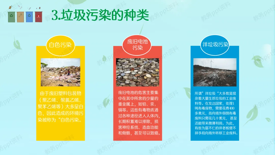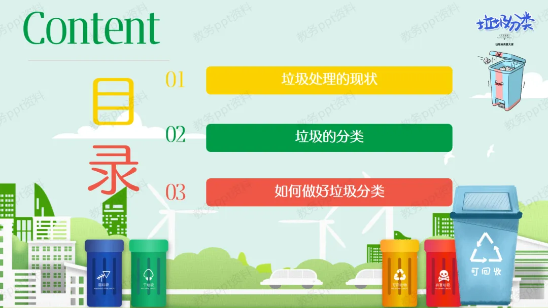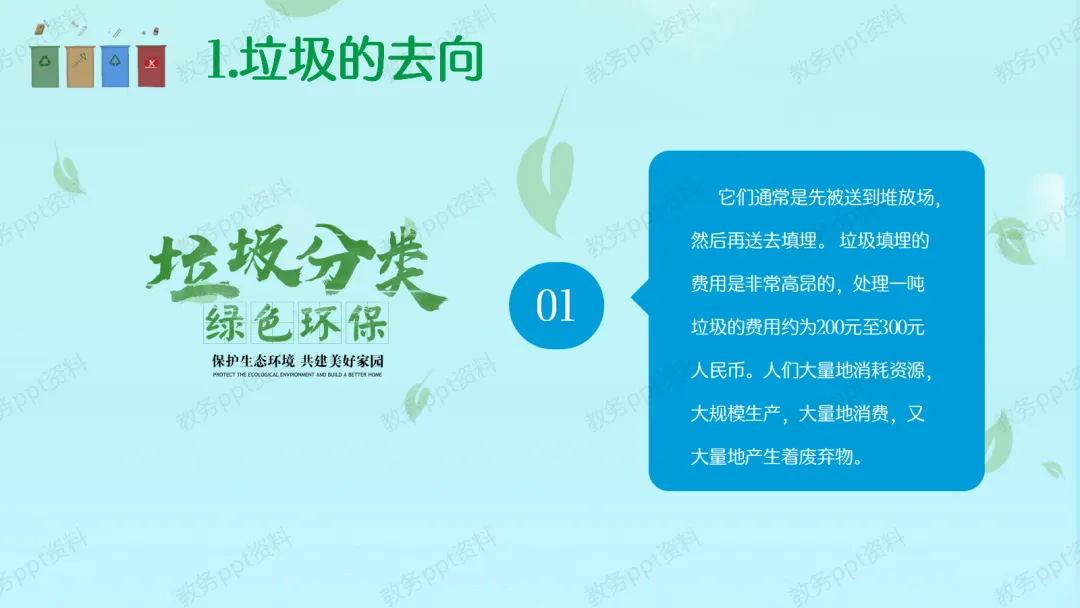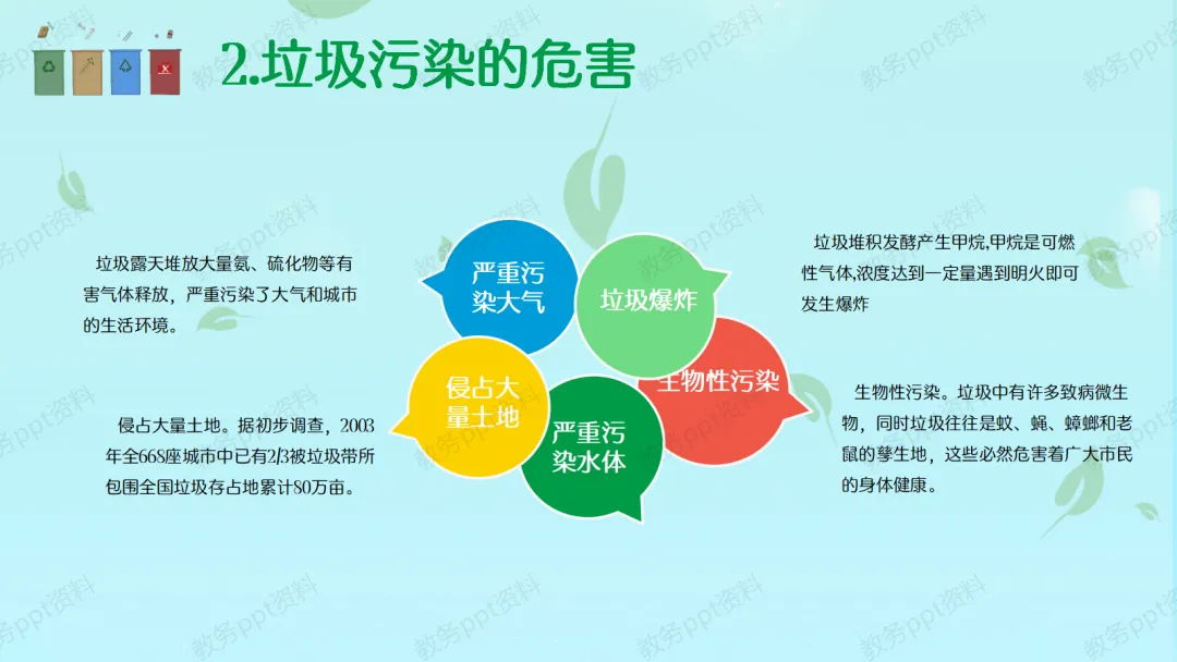 【现状与危害】其实,我们城市每天产生的垃圾非常多。根据统计数据,每年全国就有2/3的城市被垃圾包围,累计占地80万亩!这是一个非常惊人的数字。如果垃圾不分类,直接填埋,不仅处理费用高昂,还会释放有害气体和污水,污染我们的空气和水源,甚至成为蚊虫老鼠的温床,危害大家的健康。