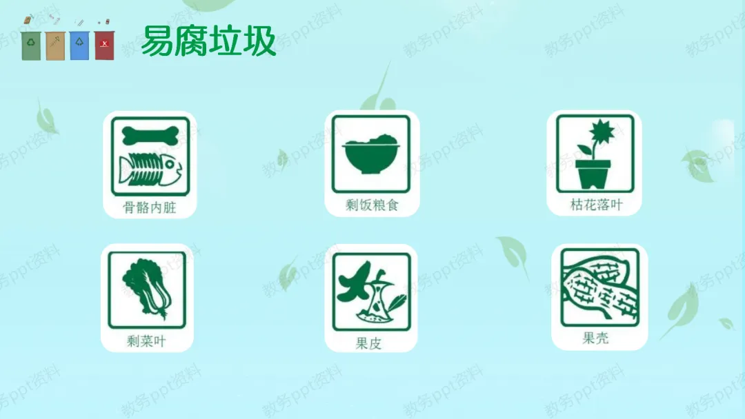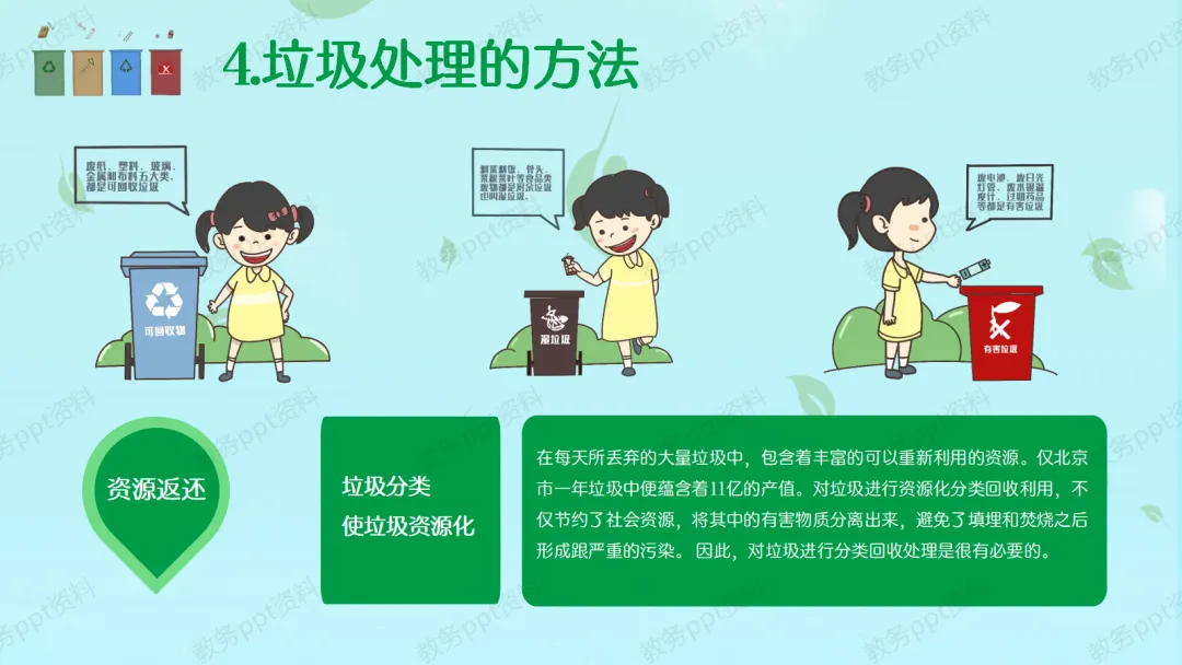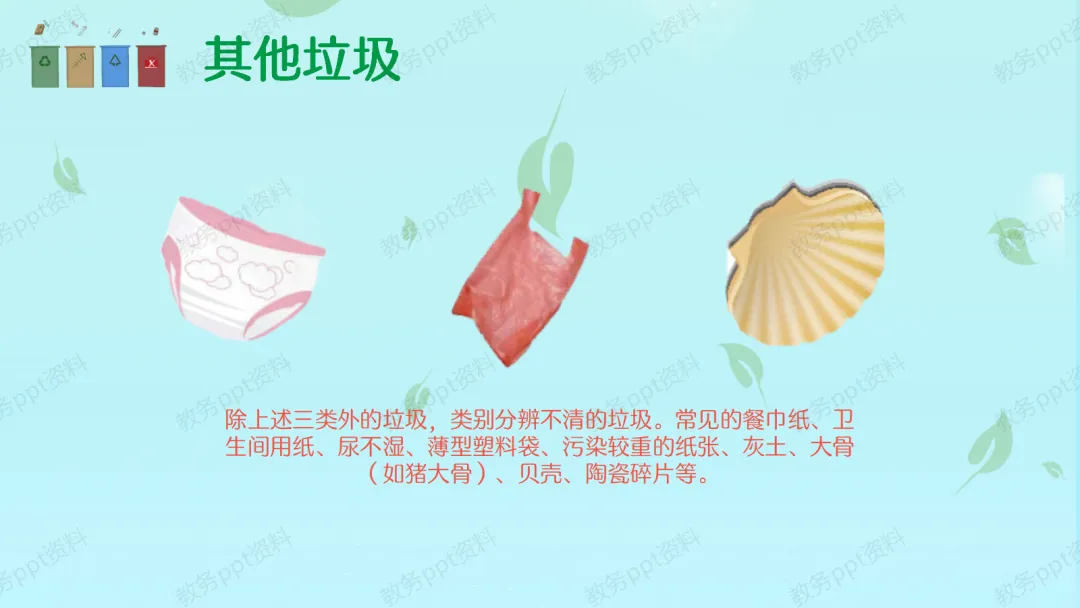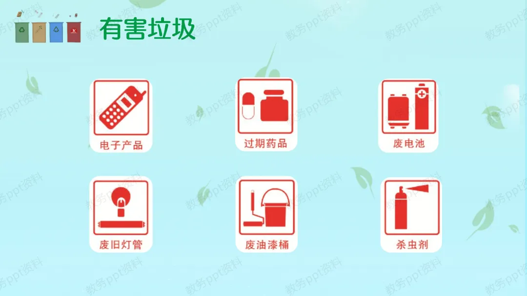 【分类教学】那么,怎么解决这个问题呢?答案就是——垃圾分类!我们要学会把家里的垃圾分成四类:第一,可回收物(蓝色),比如废纸、塑料瓶、易拉罐,这些是“放错地方的资源”,回收后可以变废为宝。第二,有害垃圾(红色),比如废电池、过期药品、废旧灯管,这些如果乱扔会毒害环境,必须特殊处理。第三,厨余垃圾(绿色),也就是我们常说的湿垃圾,像剩饭剩菜、果皮果核,它们可以变成肥料。第四,其他垃圾(灰色),比如餐巾纸、尿不湿、大骨头,这些无法回收,需要安全填埋。