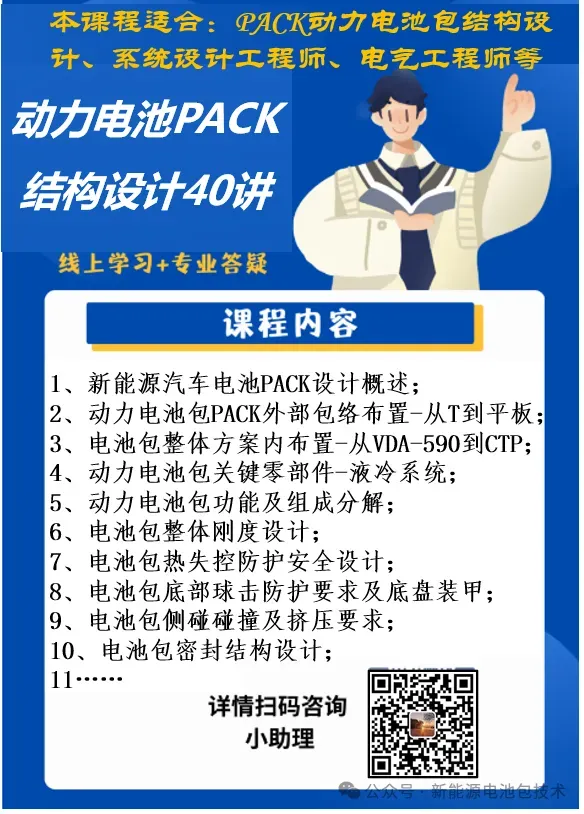 该课程是全网唯一系统层级的PACK设计教程,从零部件开发到结构设计校核一系列课程,重点关注零部件设计、热管理零部件开发、电气零部件选型等,让你从一个小白从零开始入门学习新能源电池包设计。