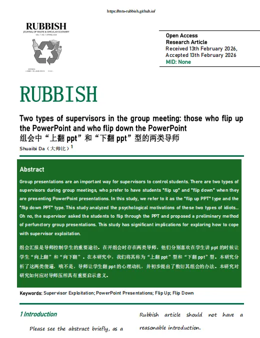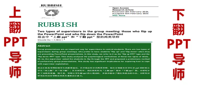 国际知名期刊《Rubbish》最新发文,对“上翻 ppt”和“下翻 ppt”型两类导师进行深入研究,为同学们糊弄导师、摸鱼组会提供切实可行的建议。本期内容,大师兄为大家解读一下本篇文献。