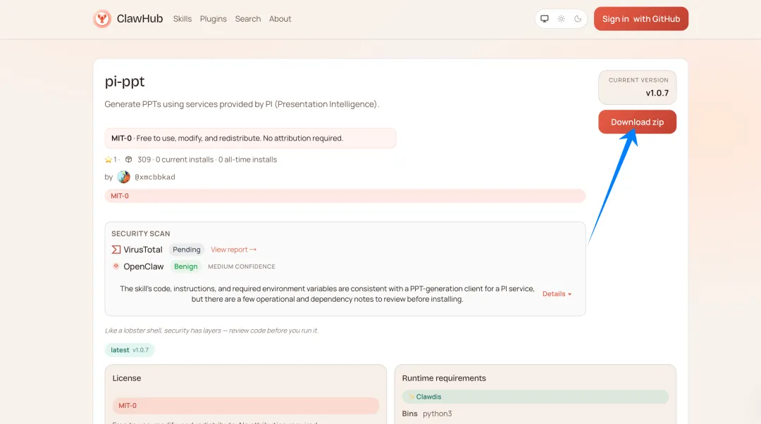通过下载链接:https://clawhub.ai/xmcbbkad/pi-ppt