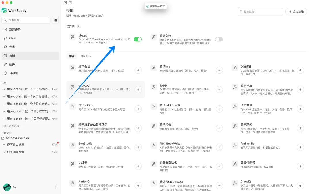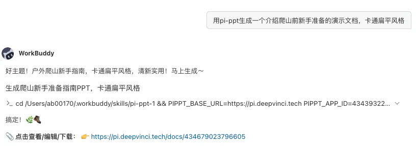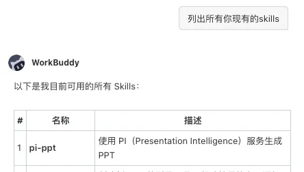安全检测通过后,即可看到Pi-ppt的技能已经成功安装。可通过 Claw 列出所有技能,确认Pi-ppt是否已就绪。