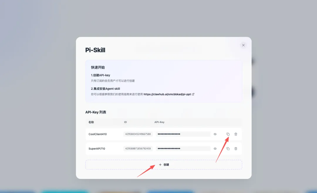 如果已创建 Key,可直接使用;如尚未创建,请点击创建。点击"copy"按钮复制key相关的信息,复制的信息包含三个字段,例如:
