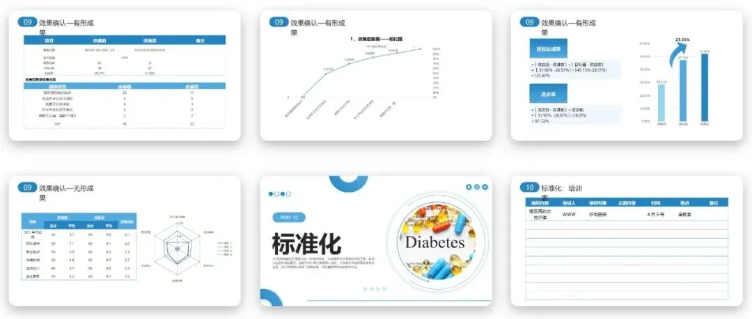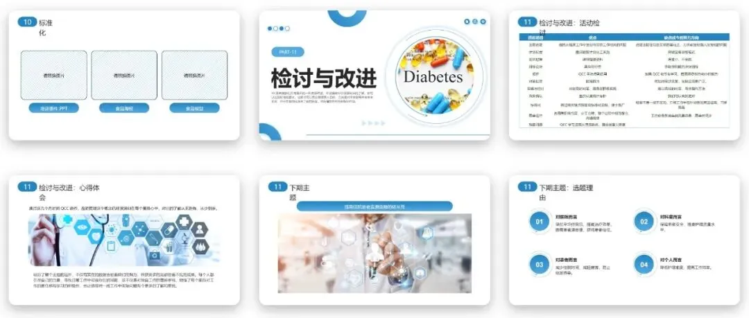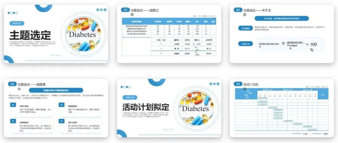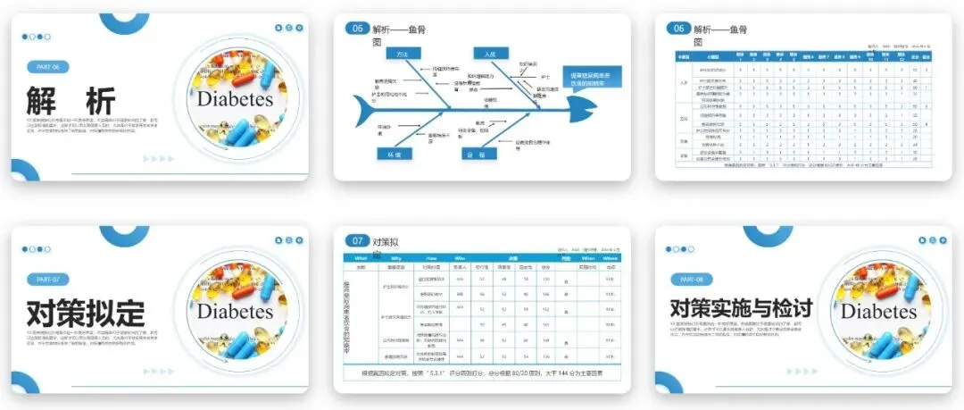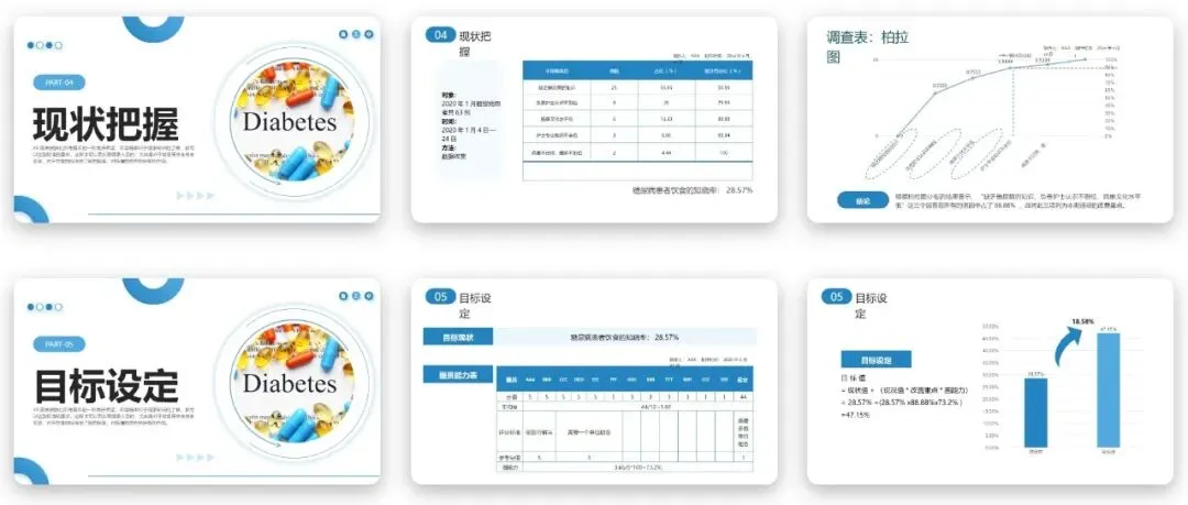 提高糖尿病患者饮食知晓率PPT中规范的甘特图设计,为本次品管圈活动的全周期进度管控提供了清晰的执行蓝图,也为同类型活动提供了参考范本。