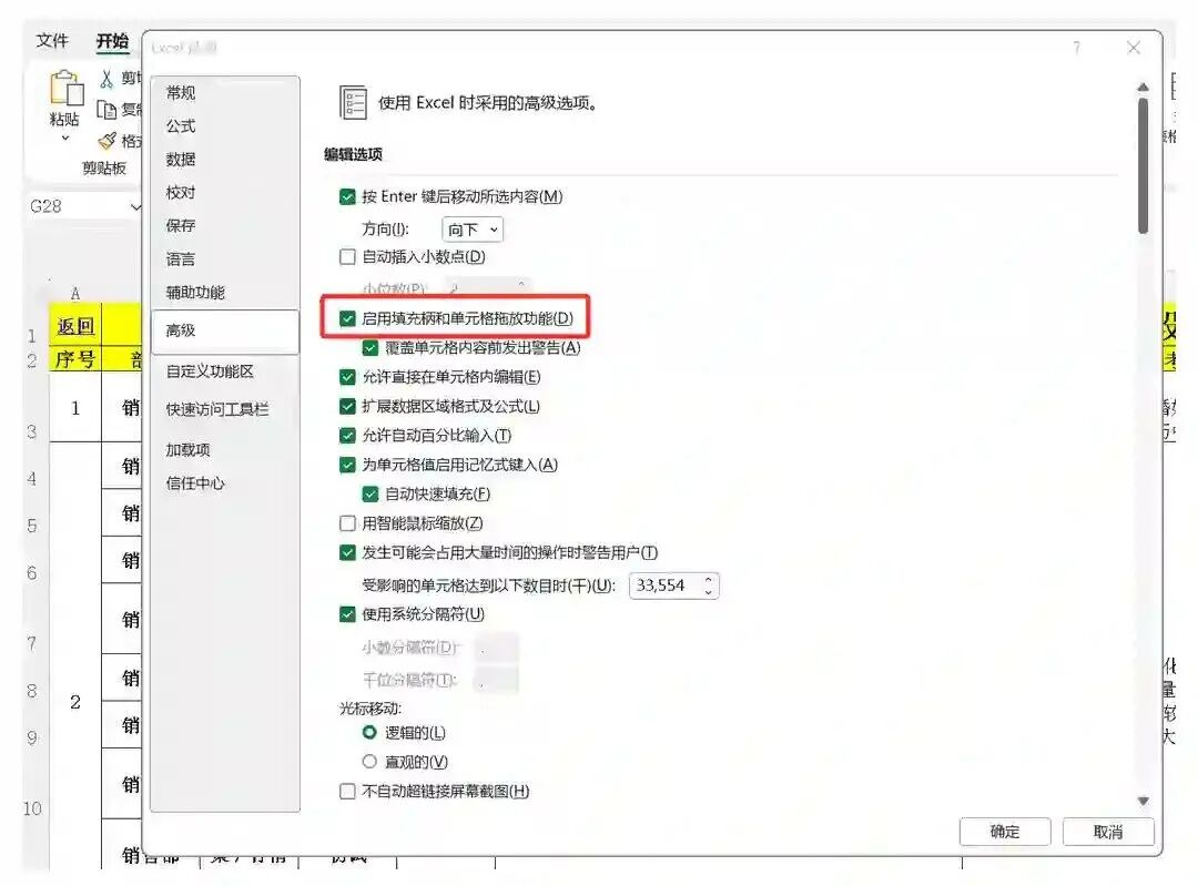 - 找到【编辑选项】,勾选【启用填充柄和单元格拖放功能】