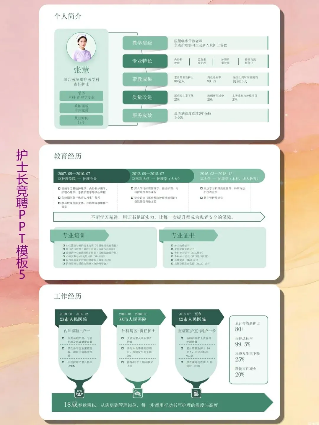 我们最怕的就是“假大空”。这份模板第一部分“护理舵手介绍”直接甩干货:累计带教新护士80余人,岗位达标率99.5%,新人独立上岗时间比院均提前15天。还有压疮发生率下降25%、跌倒事件减少20%、患者满意度连续3年≥90%。这些数据词就是你的底气。不管你是护士长做半年总结还是准备竞聘汇报,先把这些数字填进去,说服力翻倍。