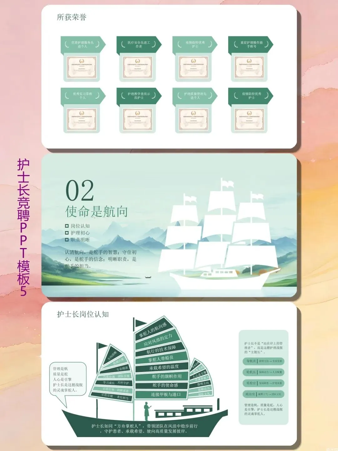 很多人在“岗位认知”部分写一堆空话。模板用“管理是帆、质量是舵、人心是引擎”三个比喻,把护士长职责拆解得清清楚楚。你不需要背大道理,照着这个框架,结合自己科室的情况往里填内容就行。比如你主导过哪些流程改进?缩短患者等候时间15%是怎么做到的?这部分就是你的护理管理思路展示区。