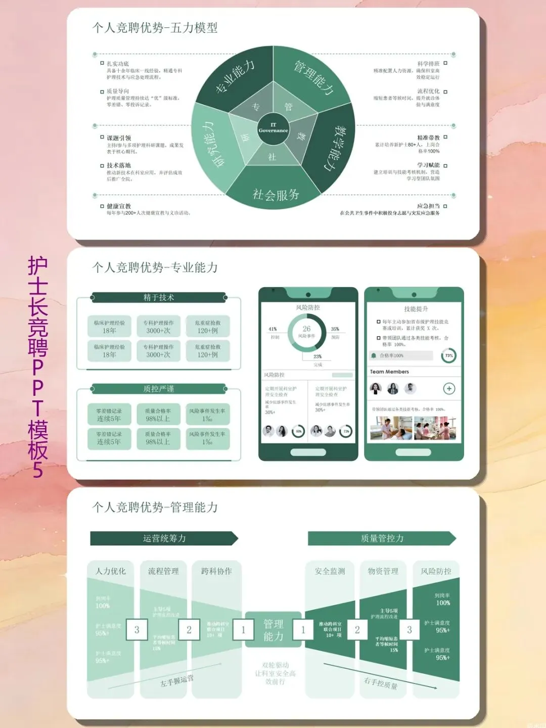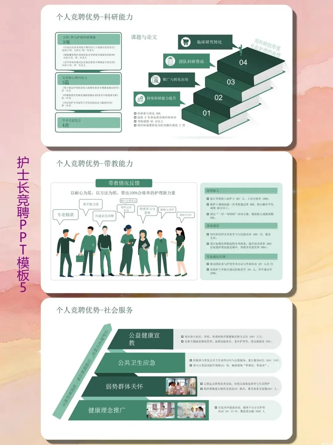 专业能力、管理能力、带教能力、科研能力、社会服务——这五块基本覆盖了竞聘考核的所有维度。模板里每一项都有具体案例和数据支撑:主导5项护理流程改进、推动跨科室联合项目10+项、发表核心期刊论文3篇。特别适合临床护士写个案报告或者科室质控分析时借鉴。还有带教成果:新护士上岗合格率100%,制定“一对一导师制”让新人成熟周期缩短20%。你直接把你的培训经历套进去就行。