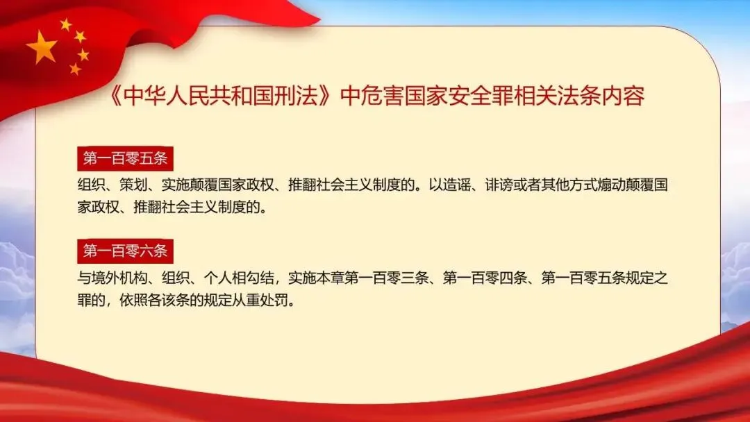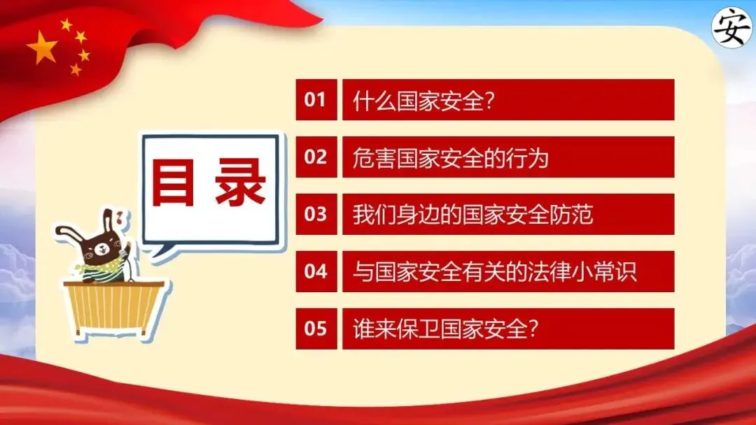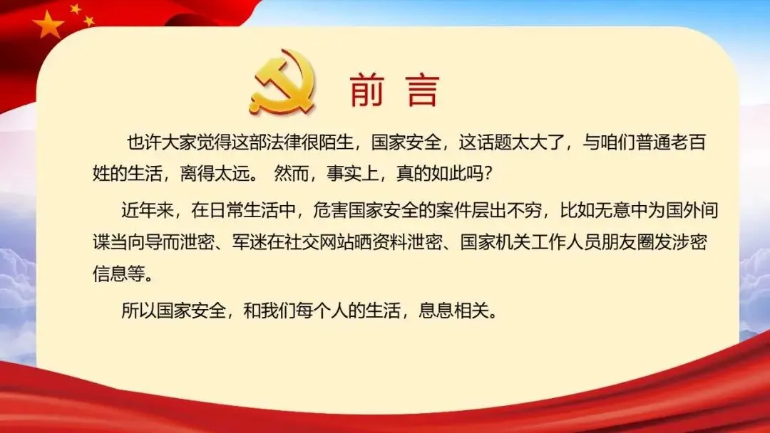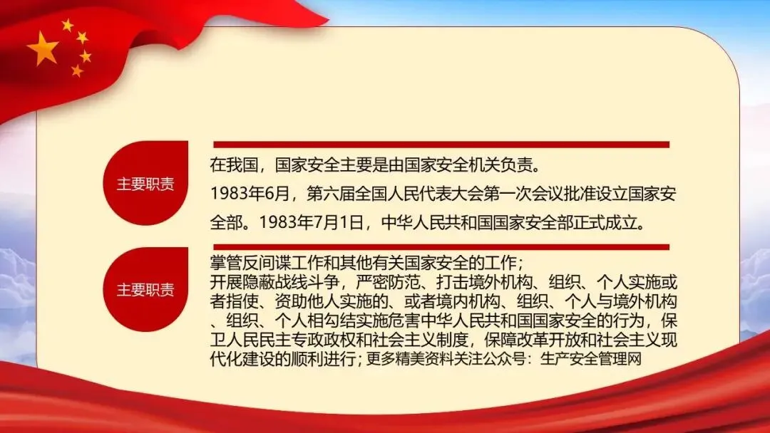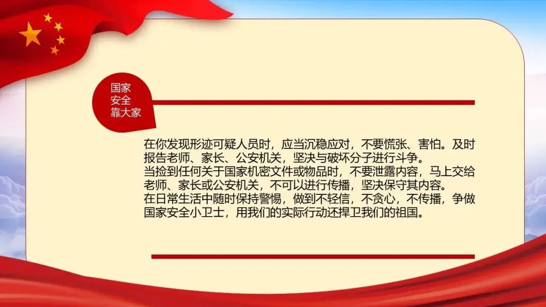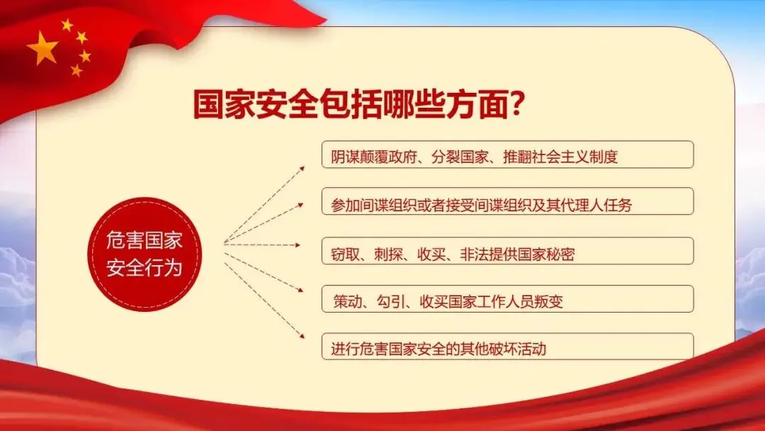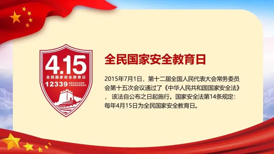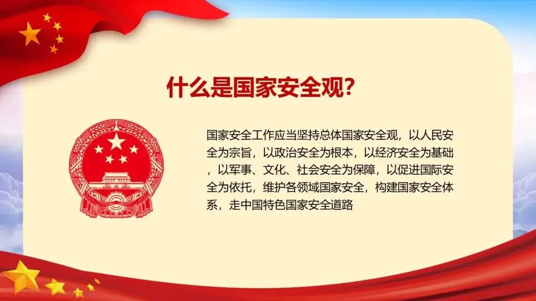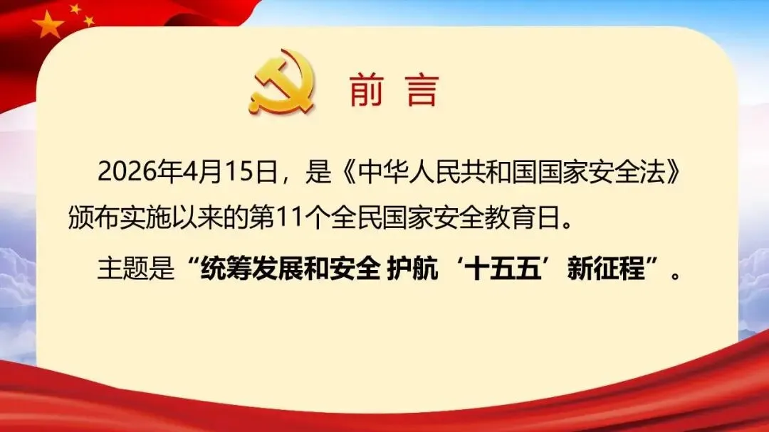 2026年全民国家安全教育日(第十一个,主题为“统筹发展和安全 护航‘十五五’新征程”)展开,系统介绍了国家安全的定义、总体国家安全观、涵盖的11个领域,并结合间谍、非法组织等典型案例警示危害国家安全的行为。同时强调信息、网络与生态安全的重要性,列举相关法律条文,指出国家安全机关的主要职责,呼吁公众从自身做起,警惕可疑行为,共同维护国家安全。