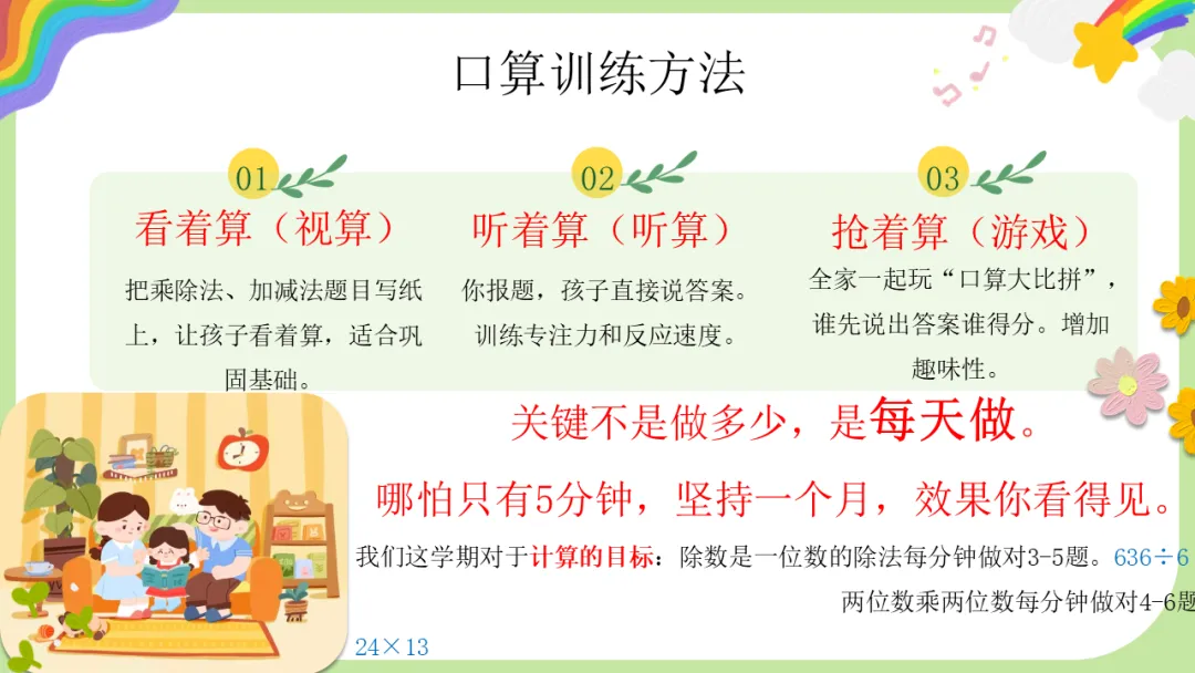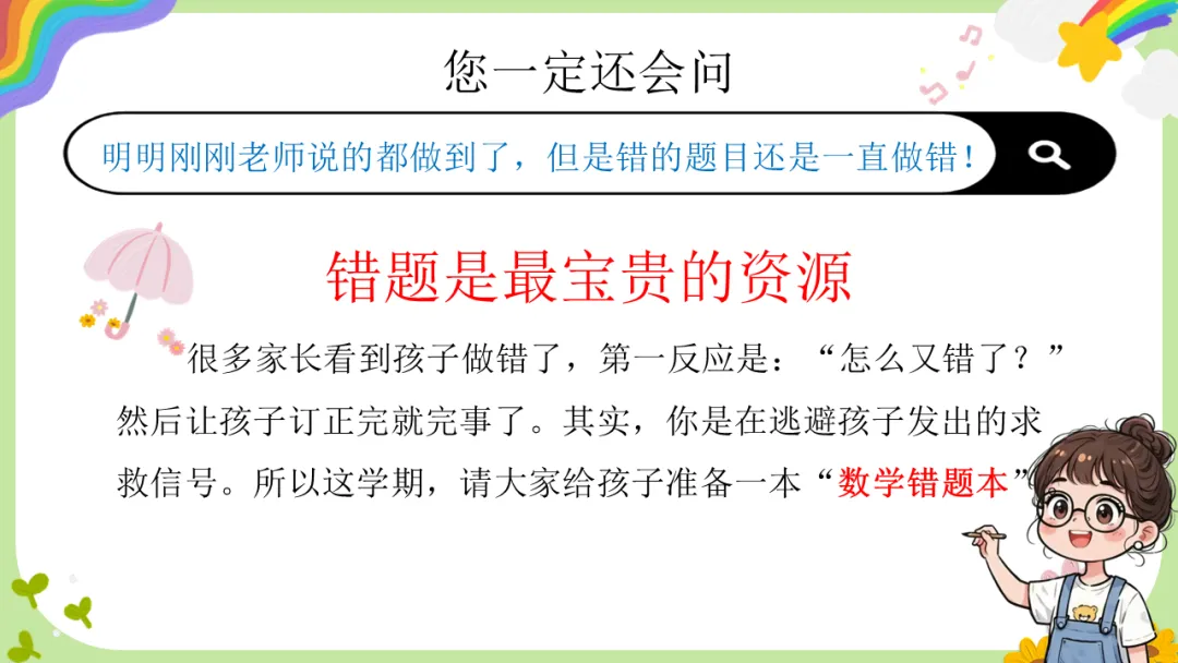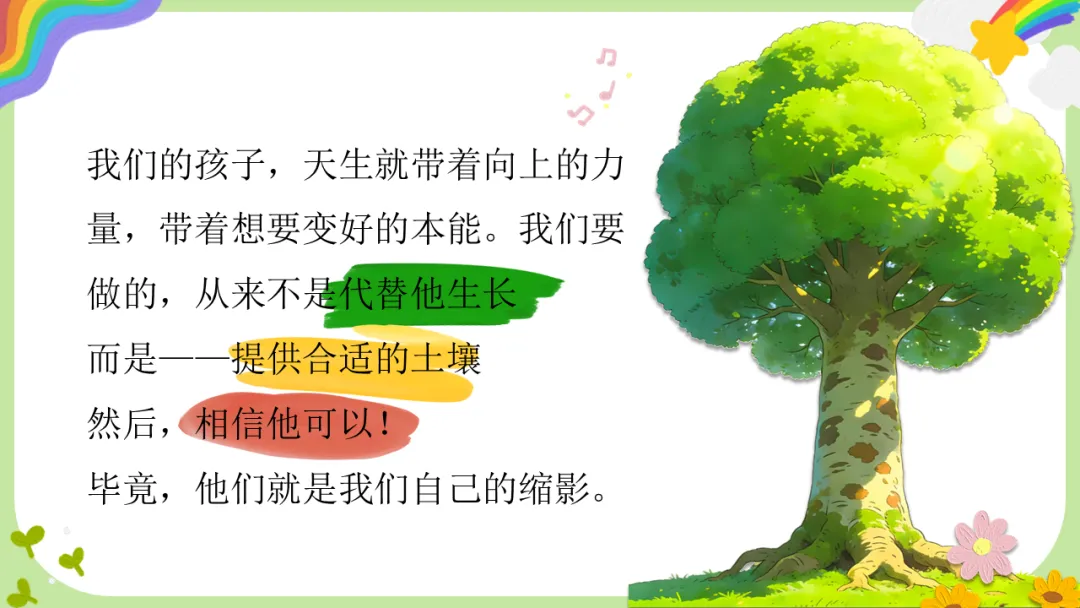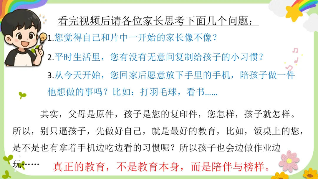 其实各位家长,有一句话想和大家分享:父母是原件,孩子是复印件,您怎样,孩子就怎样。我们总想着逼孩子进步、逼孩子优秀,却常常忽略了自己的言行。比如饭桌上,我们是不是也会拿着手机边吃边看?那孩子自然也会边做作业边玩玩具、分神走神。真正的教育,从来不是单纯的 “教” 和 “育”,而是陪伴与榜样,这也是我们今天这场家长会最想和大家传递的核心。