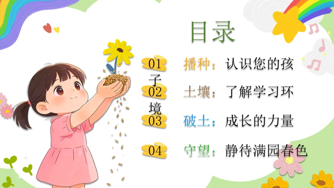 接下来,我们就从四个方面和大家详细交流,分别是认识您的孩子、了解学习环境、看见成长的力量,以及我们共同守望孩子的成长。