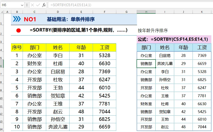 补充:如果用SORT函数,公式是=SORT(C5:F14,3,1)(3代表年龄是第3列),但SORT只能按数据内部列排序,灵活性不如SORTBY。