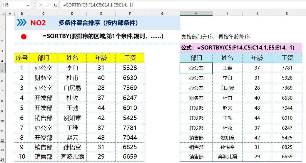 拆解:第一个排序条件是C5:C14(部门列),1=升序;第二个排序条件是E5:E14(年龄列),-1=降序。