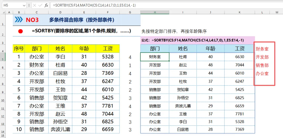 需求:先按「特定部门顺序」排序(比如预设顺序:财务室→开发部→销售部→办公室,存放在 l4:l7),再按「年龄」降序。