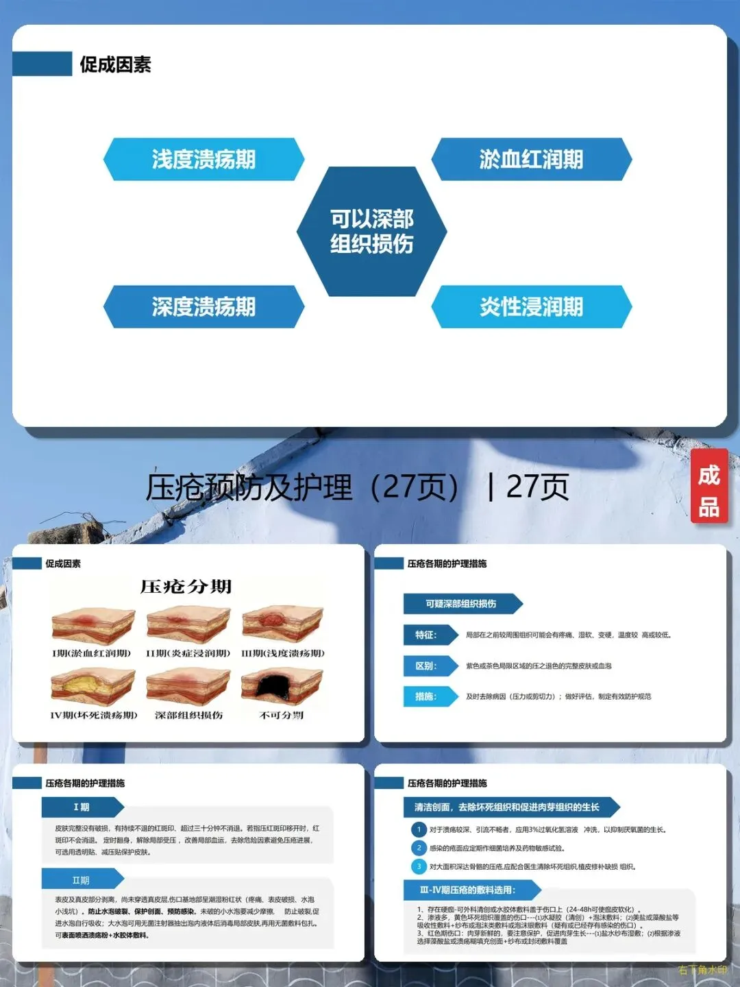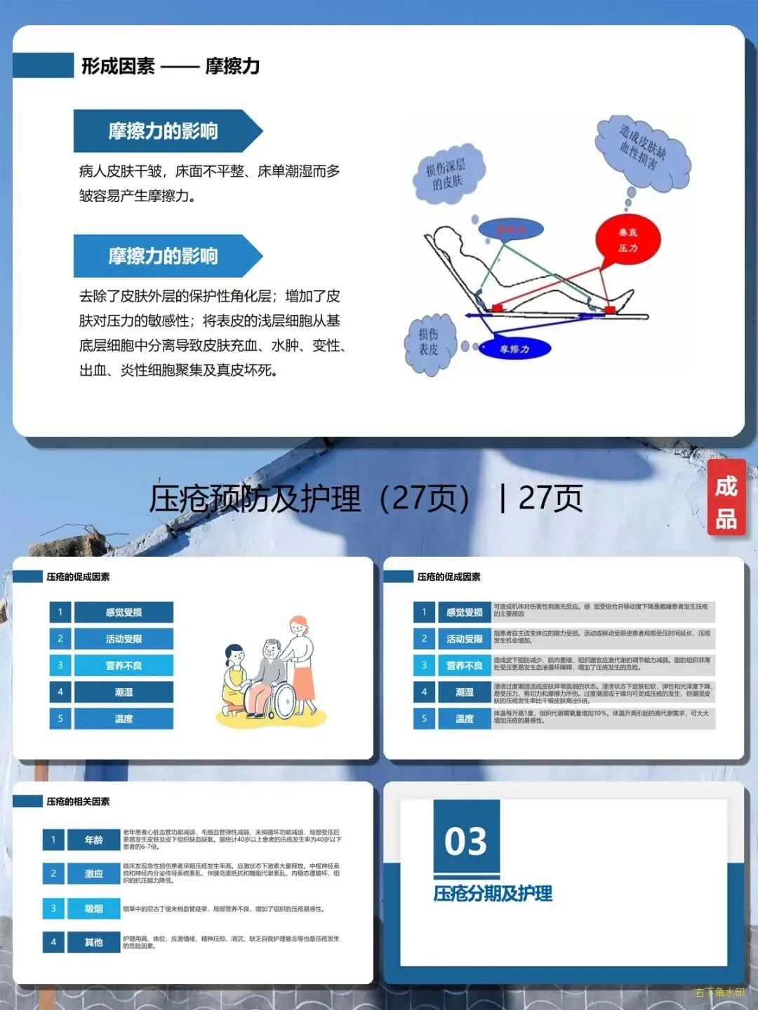 它不是枯燥的医学理论,而是拿来就能用的“护理手册”:✅ 内容全面,系统专业:27页PPT把压疮讲得透透的——从压疮的概念、发生原因,到分期护理(淤血红润期、炎性浸润期、浅度溃疡期、深度溃疡期),再到预防措施,每个环节都有详细说明,比如“翻身间隔时间不得大于2小时”“手术病人持续压力超过1小时就有发生压疮的可能”,新手护士也能快速掌握;✅ 实用干货,操作简单:PPT里有很多“接地气”的护理方法,比如Ⅰ期压疮用透明贴保护皮肤,Ⅱ期压疮用溃疡粉+水胶体敷料,Ⅲ-Ⅳ期压疮要清洁创面、去除坏死组织,家属照着做就能护理患者;✅ 预防为主,减少痛苦:强调“预防胜于治疗”,比如怎么分散压力(用减压床垫、定时翻身)、怎么减小摩擦力(保持床面平整、避免拖拉患者)、怎么消除剪切力(避免半卧位时身体下滑),从源头减少压疮的发生;✅ 图文并茂,一看就会:复杂的医学知识用简单的语言和图表解释,比如剪切力的形成原因、各期压疮的表现,即使没有医学背景的家属也能看懂。