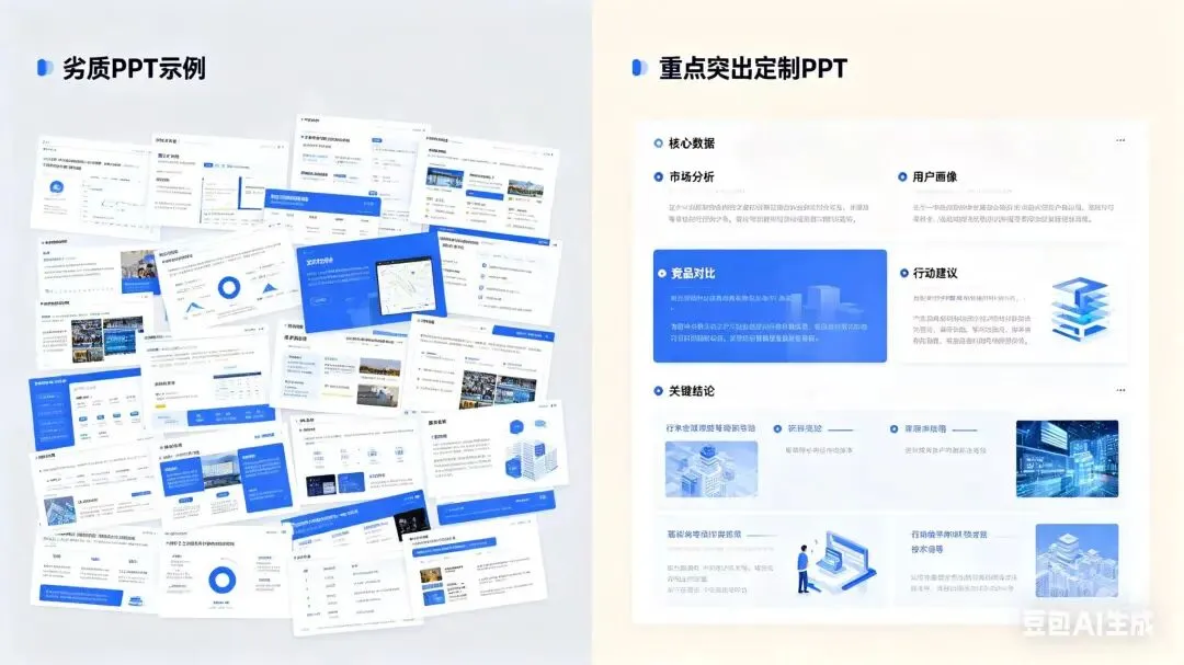 模板套用,千篇一律,毫无专属特色。网上下载的通用模板,风格老旧、适配性差,无法贴合自己的行业、项目和品牌调性,做出的PPT毫无记忆点,无法凸显独特优势。