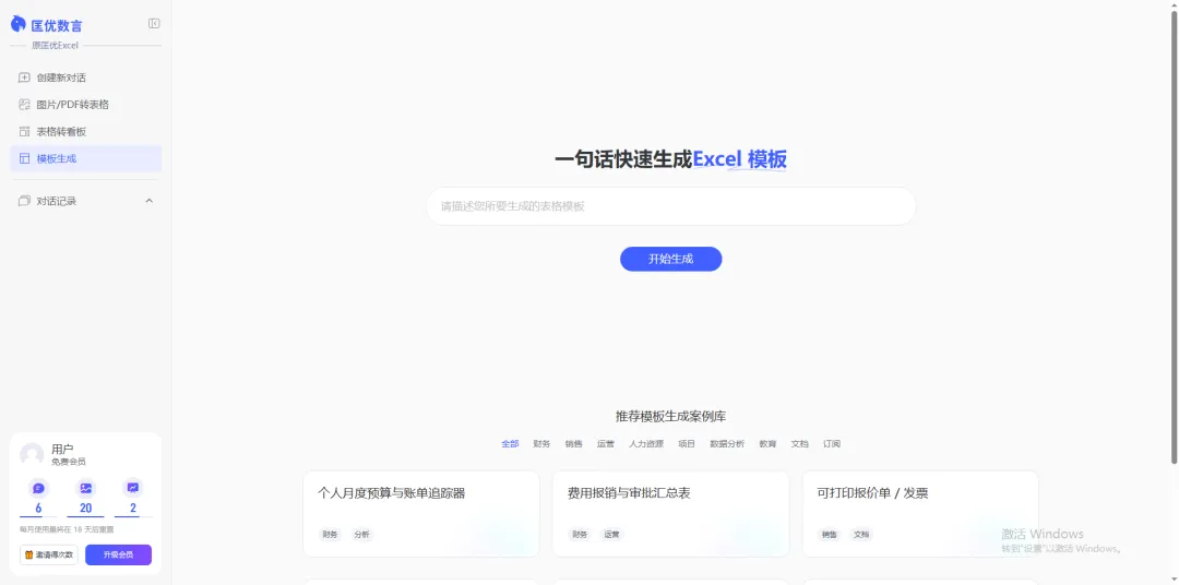 用匡优数言的 AI 模板生成功能,你只需要用中文说清楚你要什么,几秒就能生成一张带公式、可直接使用的专业表格。
