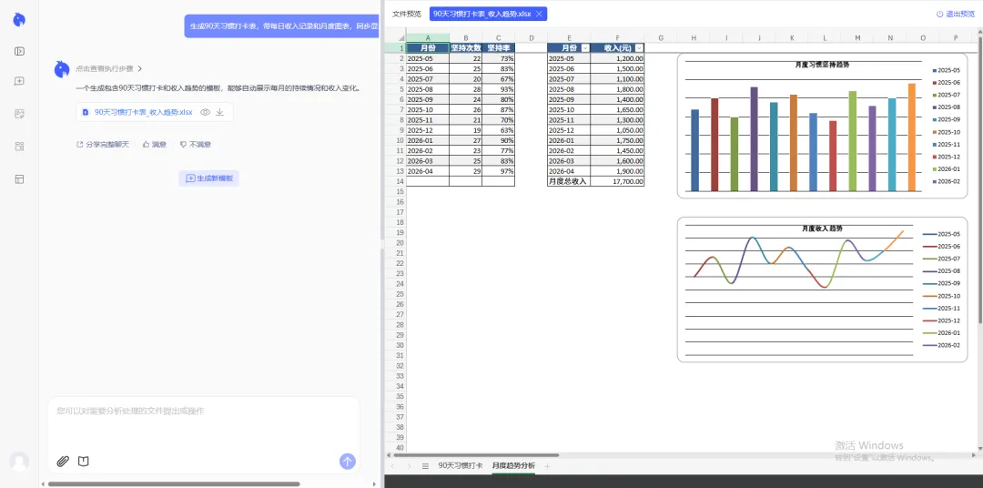 生成 90 天习惯打卡表,带每日收入记录和月度图表,同步展示习惯坚持与收入趋势。