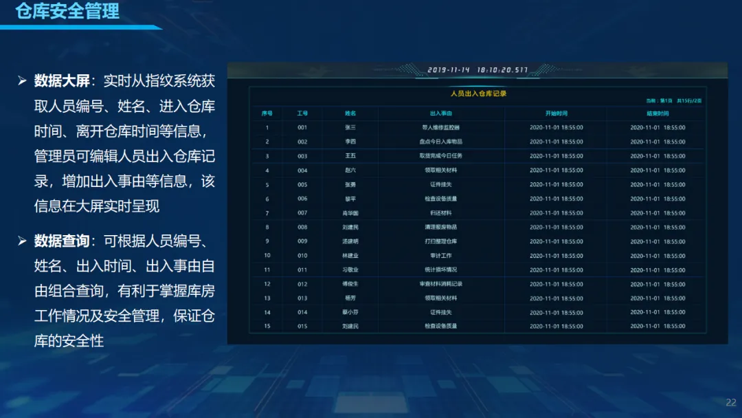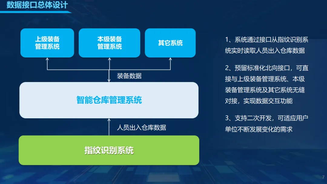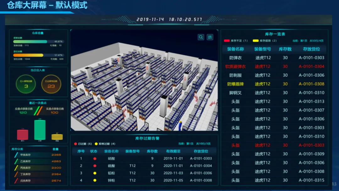 方案具备3D仓库可视化、库存实时预警、物品快速定位、有效期与维保提醒、自动报表生成等核心能力,配合权限管理、操作日志、数据加密与容灾备份,保障系统安全稳定运行。同时提供标准化接口,可与上级装备系统、指纹识别、ERP等平台无缝对接,支持二次开发与灵活扩展。