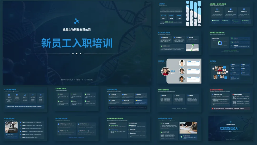 入职培训|蓝色生物科技入职培训免费PPT模板(文末自取)