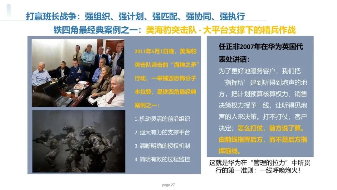- 前端:铁三角 / 铁四角拥有现场决策权,“让听得见炮声的人指挥战斗”。