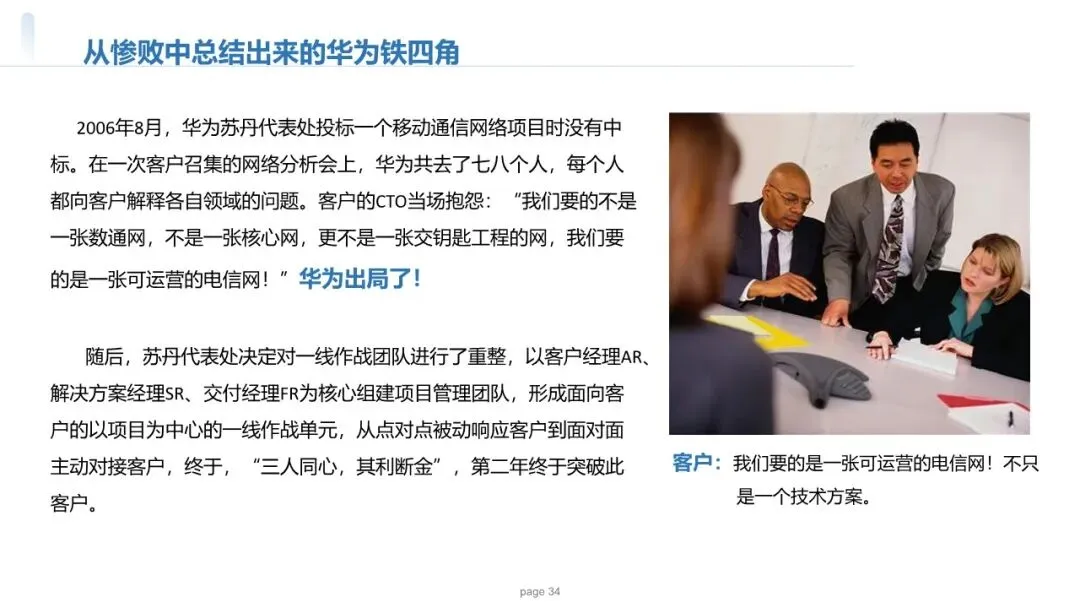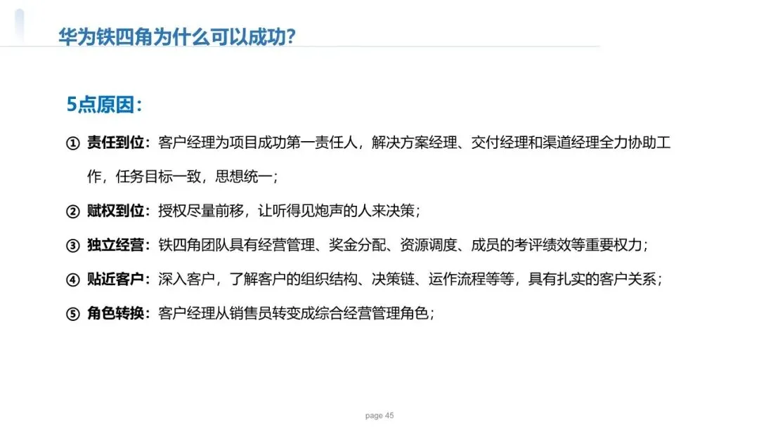华为的核心不是 “铁三角” 这个组织,而是围绕客户价值统一目标、流程、权责与激励的系统能力。关键是让一线拥有决策权、后台提供强支撑、全员共担成败,最终实现从 “卖产品” 到 “做客户成功” 的转型。