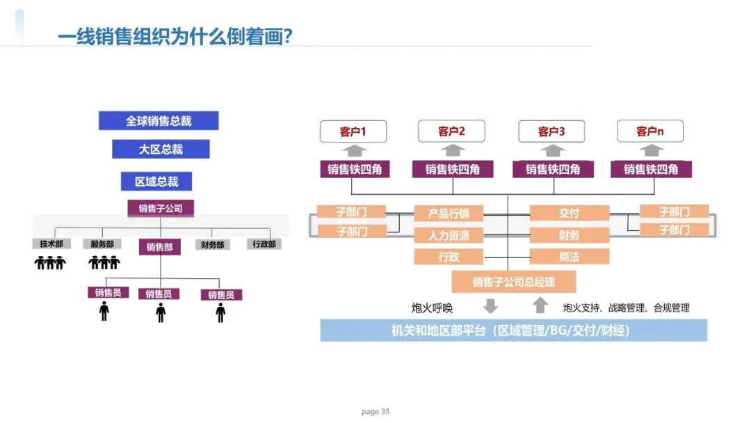 - 后端:重装旅(行业专家、解决方案专家)、共享中心(财务、法务、供应链)提供炮火支援,统一标准与资源调度。