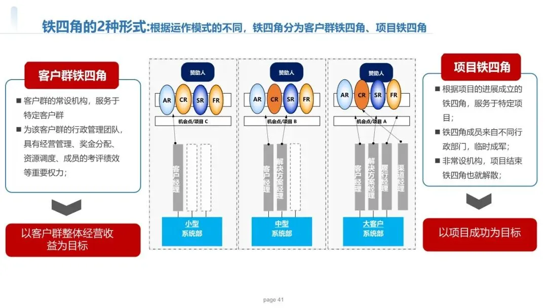 - 铁三角(基础版):AR(客户经理,客户总负责)、SR(解决方案,技术谈判)、FR(交付,履约管控),三人平级、共担成败,共享决策权。