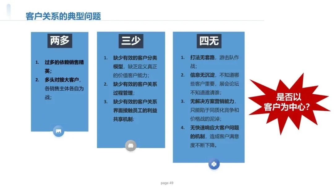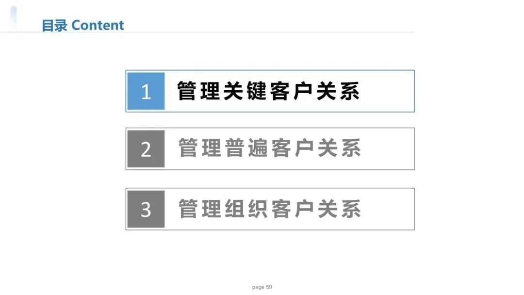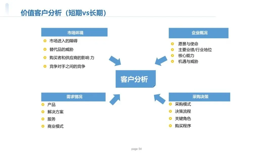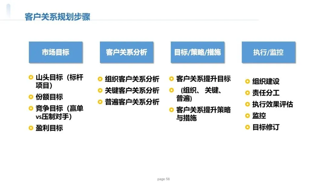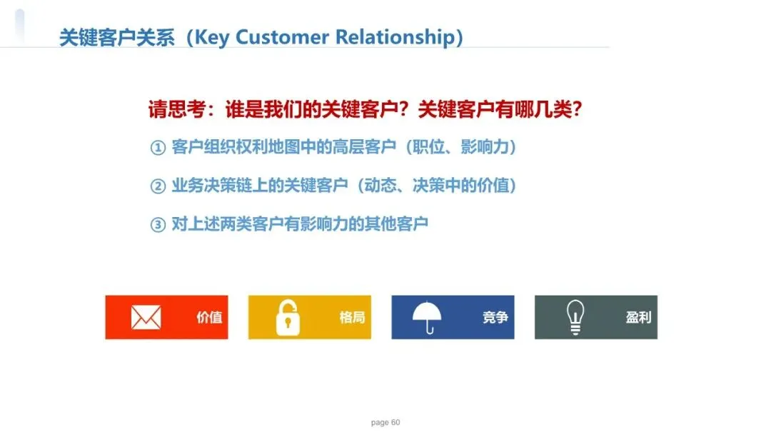 - 关键客户关系:聚焦决策链高层(CXO)、痛点关键人,用 “九宫格” 动态管理,个性化策略(如对反对者做危机公关,对战略伙伴建联合创新中心)。