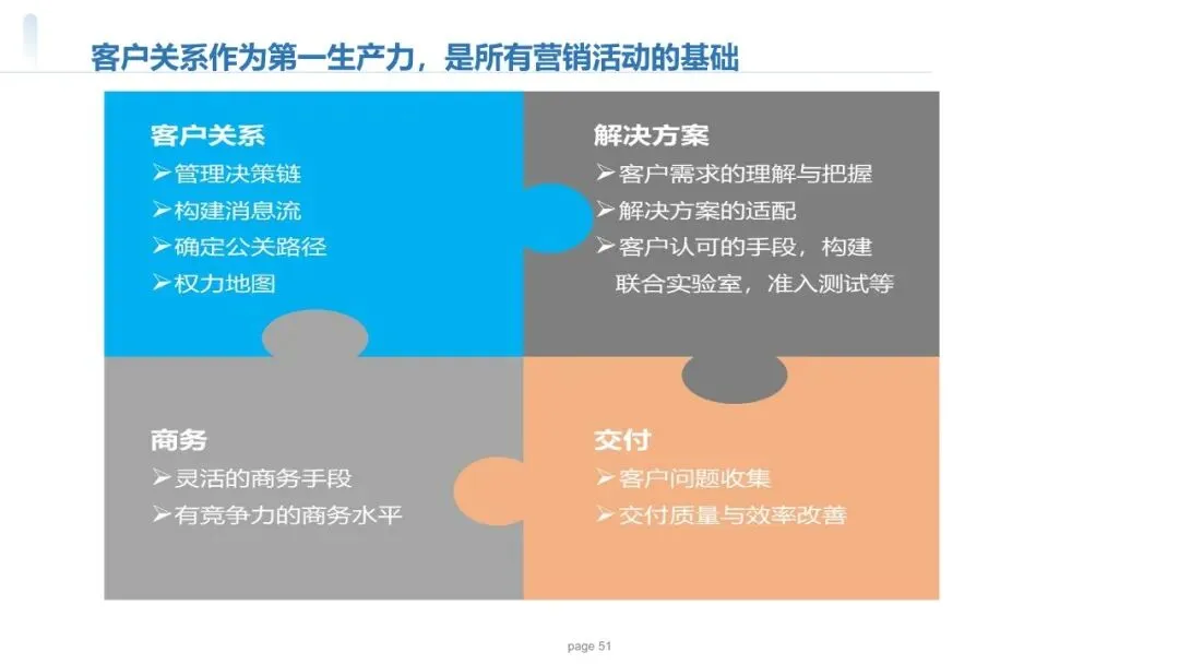 - 普遍客户关系:覆盖客户全接触点(技术、采购、财务、用户),通过联合创新、交付提升满意度。