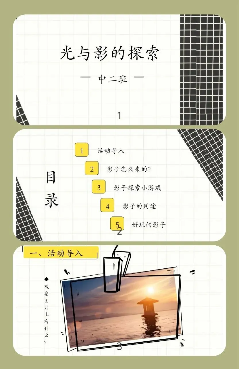 教师:古时候人们没有钟表,会使用影子进行计量时间。天气热了,还能在影子下乘凉。中国古代有中皮影戏,即使流传到现在也广受欢迎。光一照,两个小手还可以玩手影游戏。