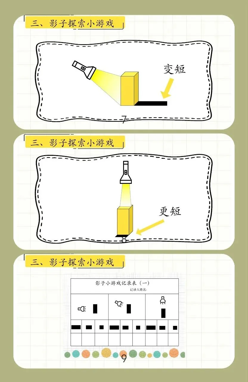 根据ppt内容操作光影小游戏,操作中将小朋友分组安排好方便幼儿们合作进行实验,并给到每个小组一套材料包括:手电筒、积木、记录表2张。游戏过程中再进行单组的观察和引导。