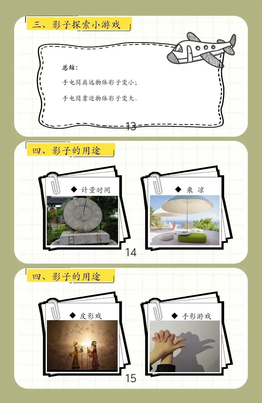 小结:影子有计量时间、乘凉、皮影戏、手影游戏的作用。