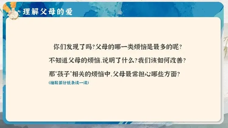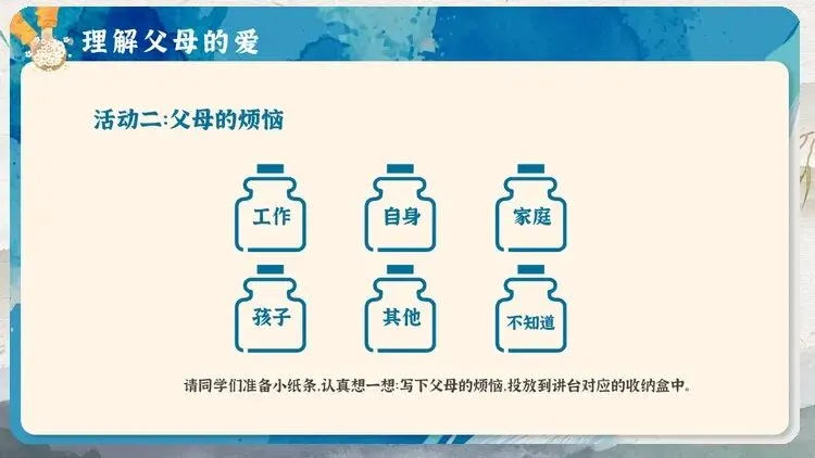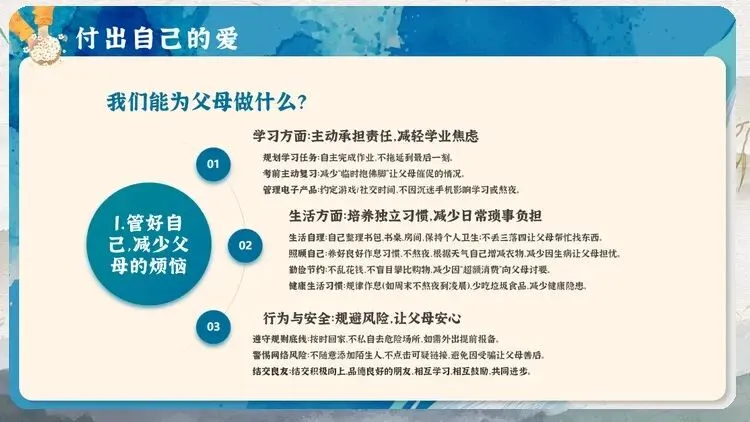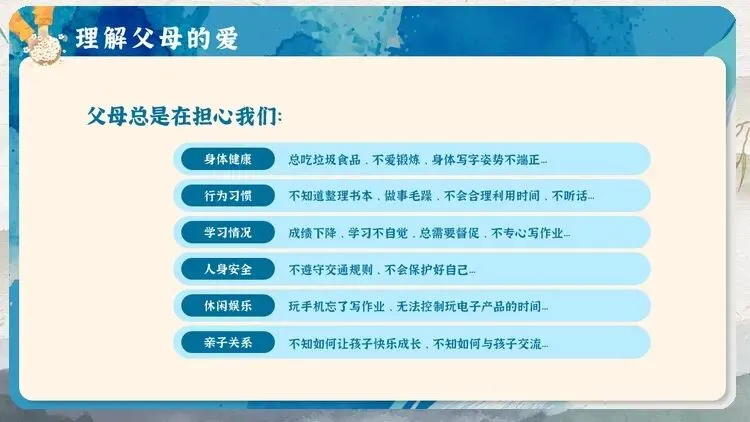 本公众号专注于整理制作更新发布教师用教务资料,包含但不限于:家长会课件,主题班会课件,校长讲话稿,德育安全资料,班主任库,计划总结等资料,文末“阅读原文”可查阅10万+教务资料。关注公众号,以备不时之需。【中小学】【感恩教育】主题班会ppt《感恩父母,与爱同行》附讲稿