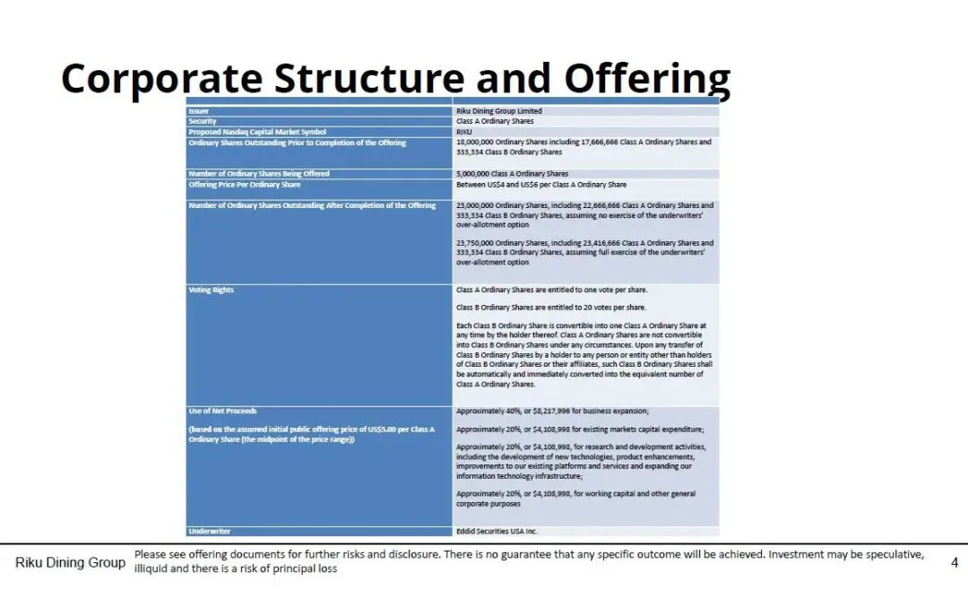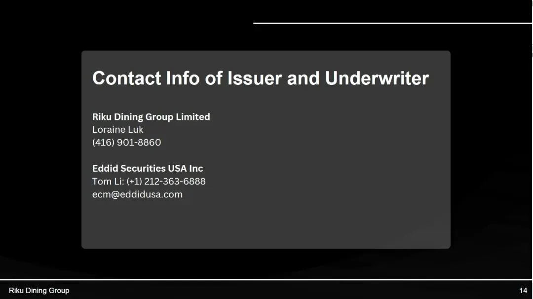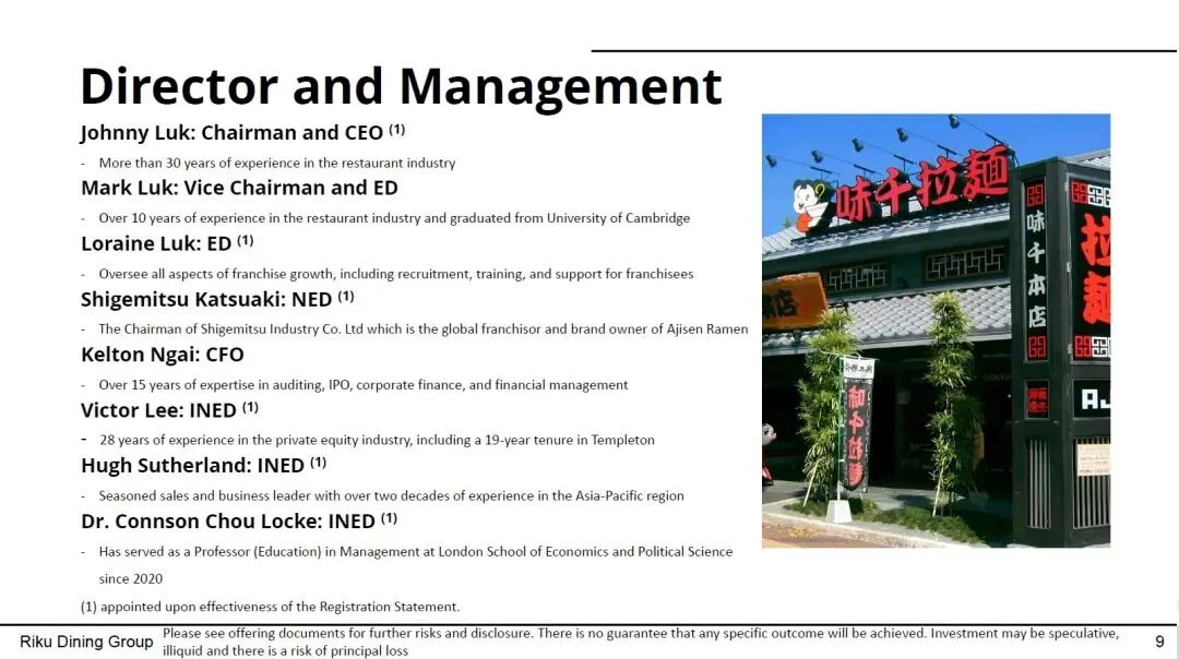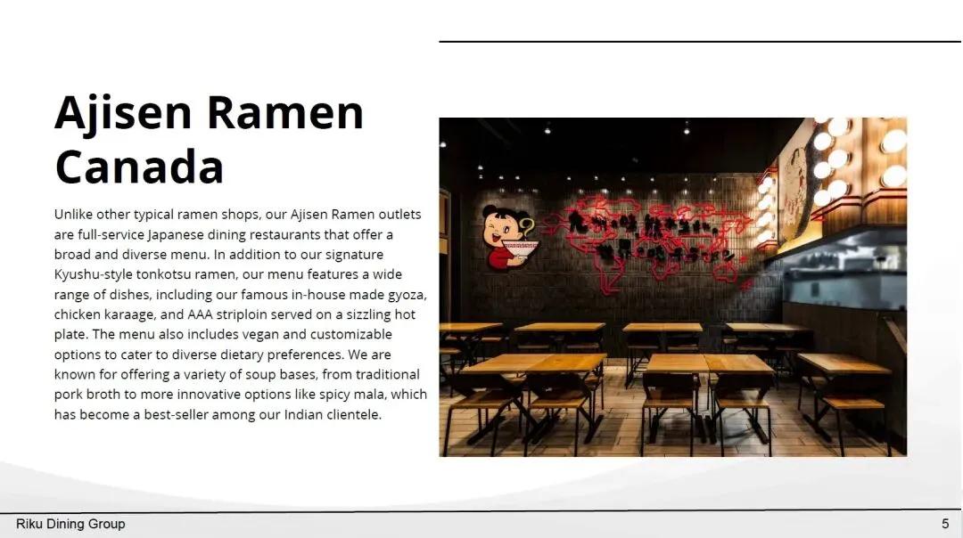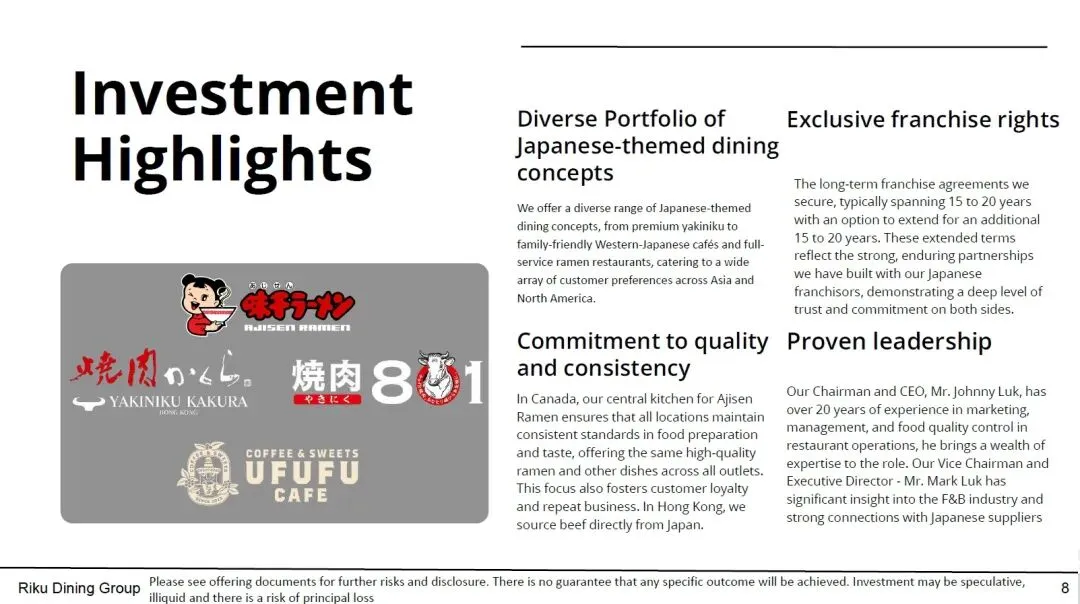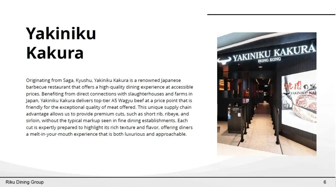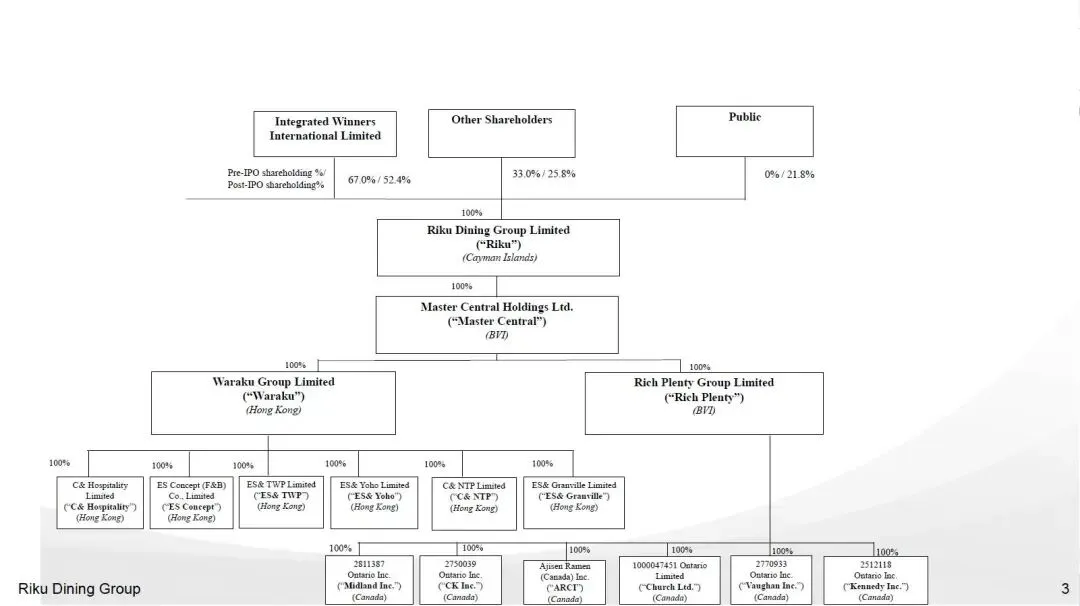 RIKU DINING GROUP为一家在开曼群岛注册成立的控股企业,总部位于加拿大多伦多,拥有全职员工169人,是一家布局国际化的日式餐饮运营集团,业务主要覆盖加拿大及中国香港地区。