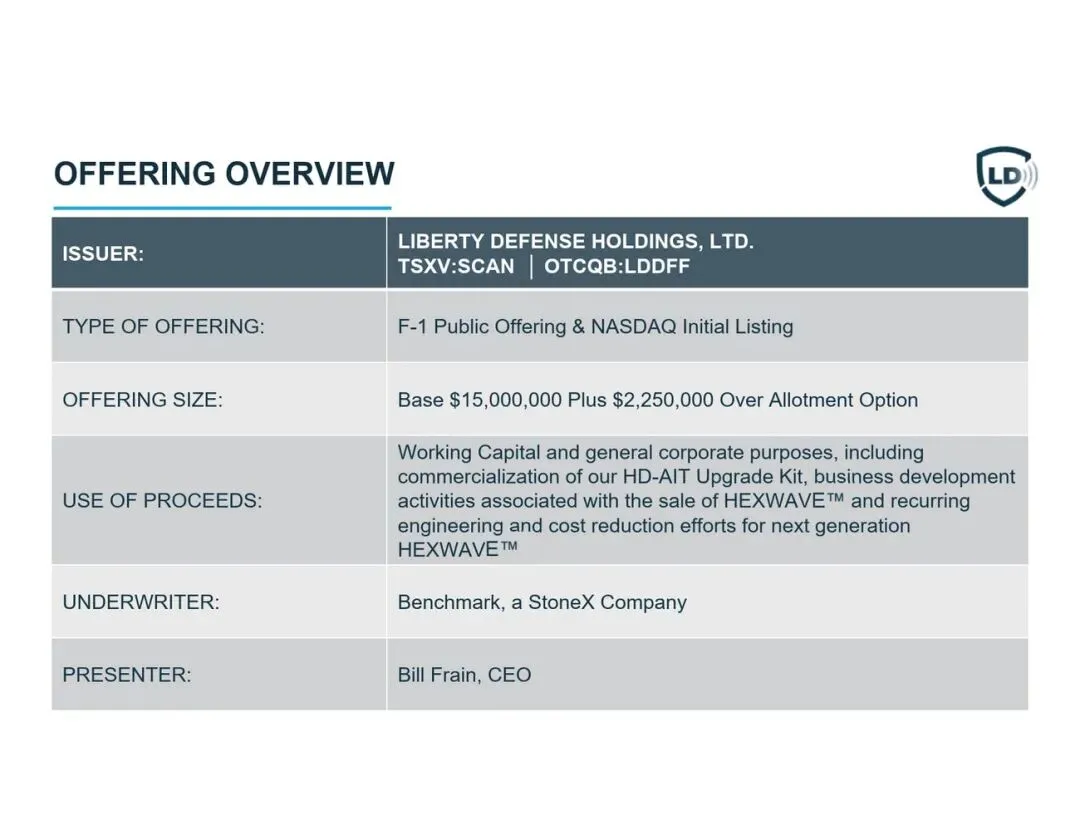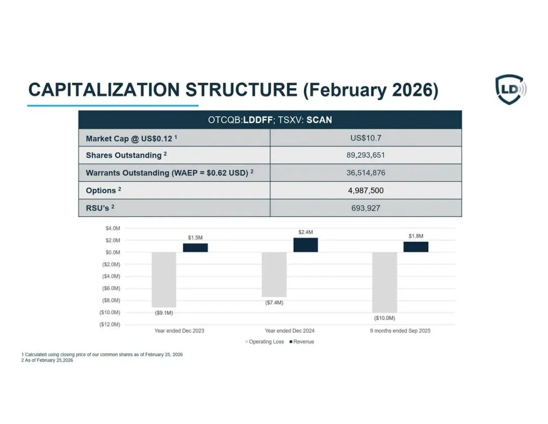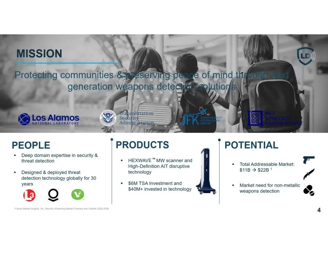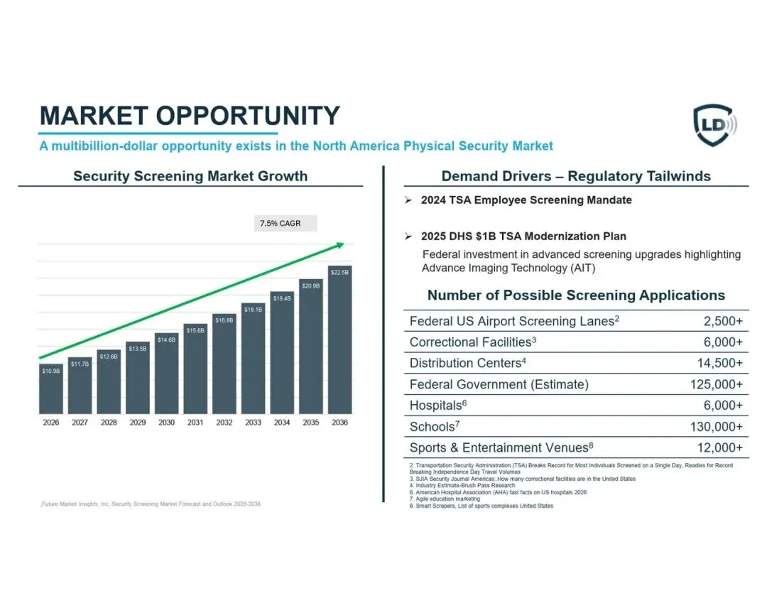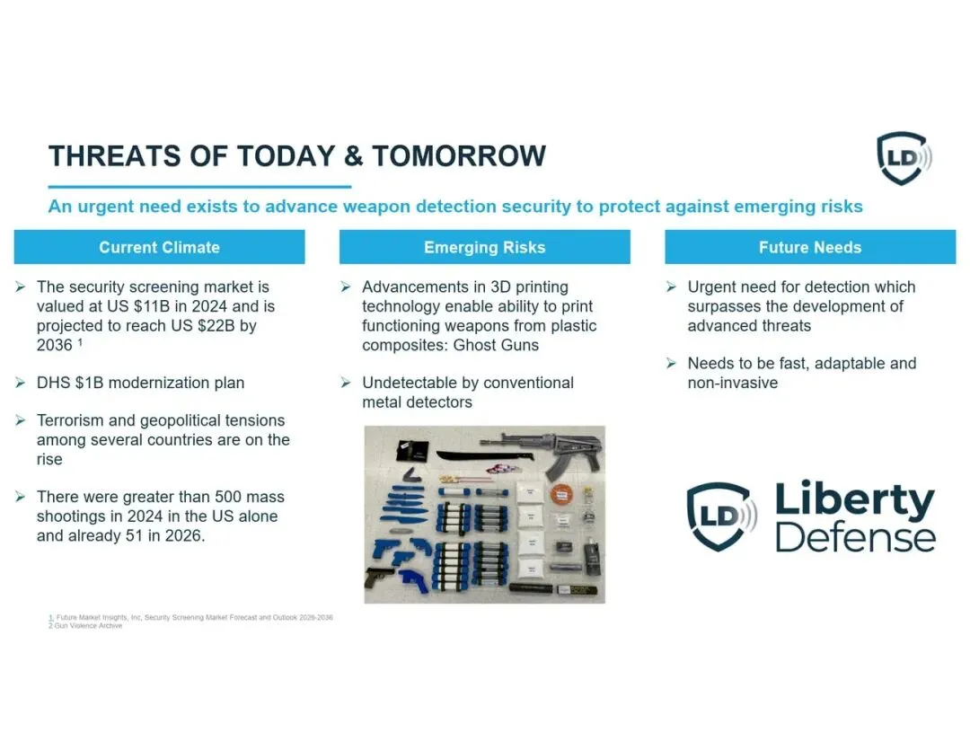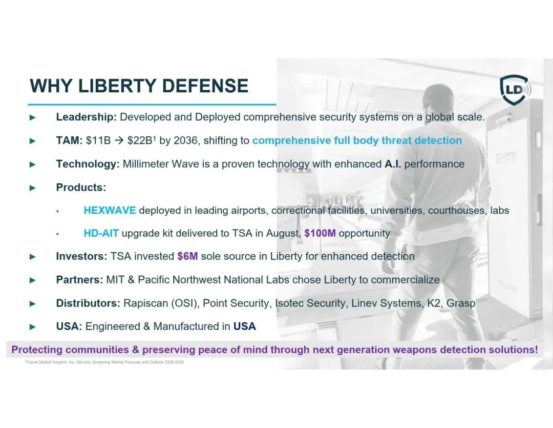 Liberty Defense Holdings是一家开发AI驱动的非接触式安检系统的科技公司,其核心产品HEXWAVE™ 旨在用更高效、更友好的方式替代传统金属探测器,解决公共场所安检中的误报率高和通行效率低的问题,目前处于早期商业化阶段。2024年,该公司净亏损885万美元。