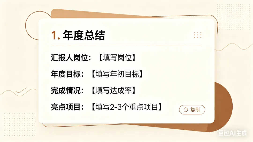 - 2、包含:年度回顾→关键成果→项目亮点→不足反思→明年规划