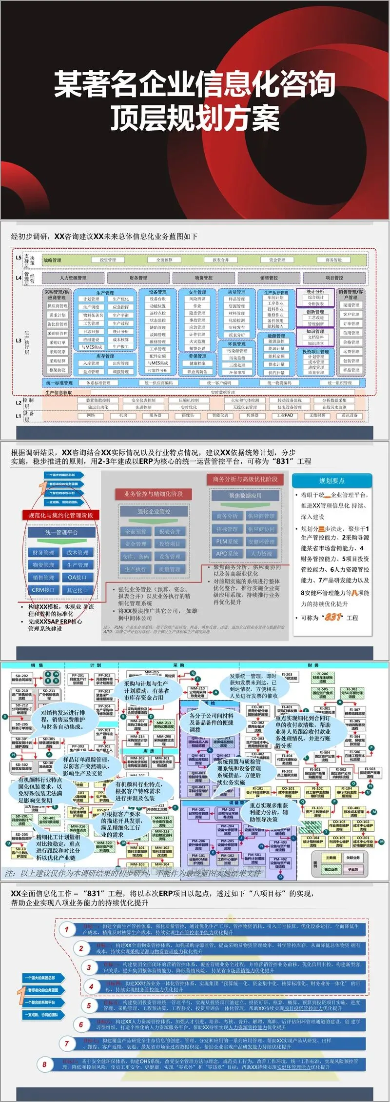 方案首先明确了总体业务蓝图,构建了 “L1 设备层 - L2 控制层 - L3 生产执行层- 管理层” 的四级架构,覆盖生产、物资、销售、财务、人力、设备、安健环等全业务领域。核心规划围绕 “831” 工程展开,即通过 2-3 年时间,分三阶段建成统一运营管控平台:第一阶段为规范化与集约化管理阶段,搭建 SAP ERP 核心系统,实现业务流程与数据标准化;第二阶段为业务管控与精细化阶段,强化预算、资金、报表合并等管控功能,推广核心模块至各子公司;第三阶段为商务分析与高级优化阶段,聚焦数据应用与业务协同,推行高级应用系统,实现全价值链优化。