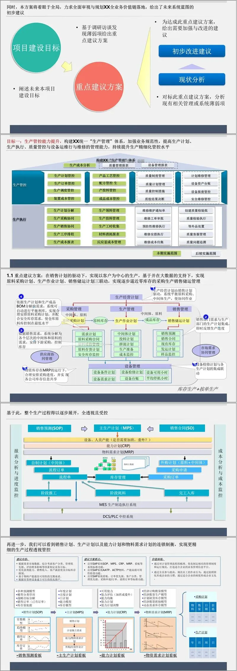 八大核心建设目标构成了方案的核心支柱。生产管控方面,构建统一生产管理体系,实现销售、采购、生产计划三联动,通过批次管理与配方精细化管控,降低生产成本并保障质量追溯;物资管控聚焦需求计划与平衡利库,建立差异化采购策略与一体化库存管理,降低物资拥有成本;营销管控覆盖 “端到端” 业务,集成客户信用管理、价格管控与发运调度,提升营销效率与风险防控能力;财务管控打造 “纵横一体化” 平台,实现预算统一化、资金集中化、核算标准化,通过财务业务一体化实现物流、资金流、信息流三流合一。