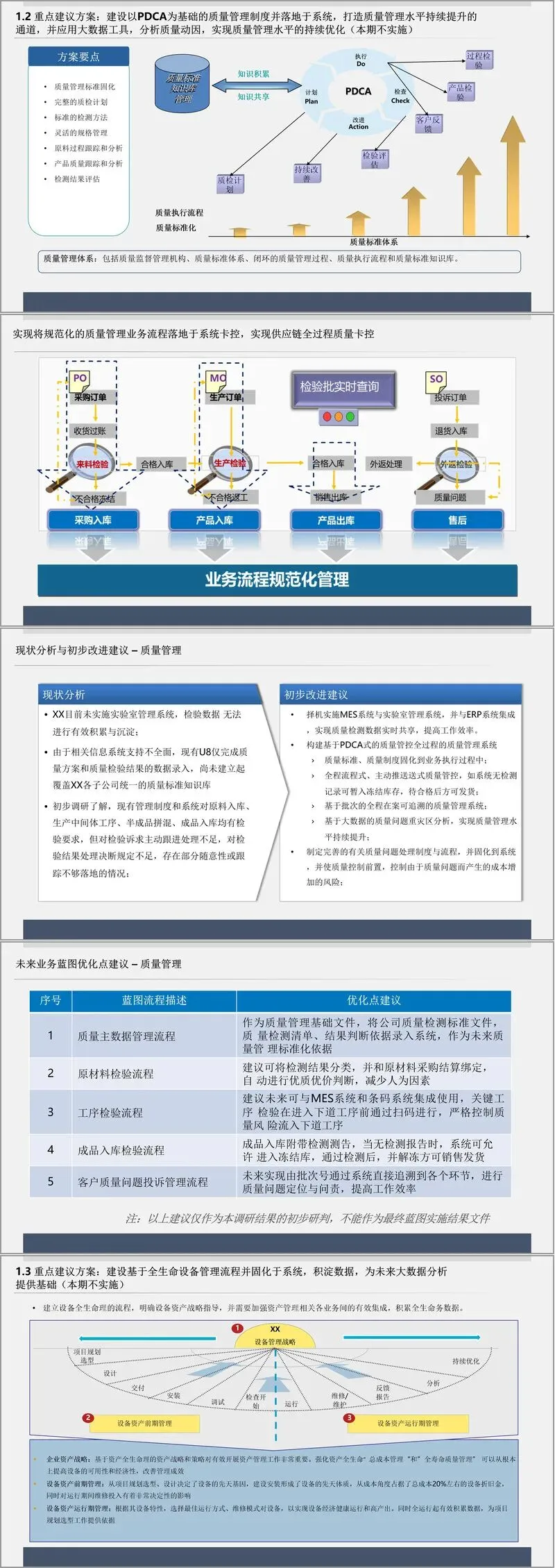 此外,方案还明确了项目投资、人力资源、产品研发、安健环四大管理维度的建设路径:项目投资实现从可研到后评估的全生命周期管控;人力资源构建 “共性 - 个性” 结合的管理体系,覆盖人事、薪酬、培训等核心模块;产品研发通过 PLM 系统实现全生命周期数据积淀;安健环基于 OHS 系统,实现风险预控与合规管理。