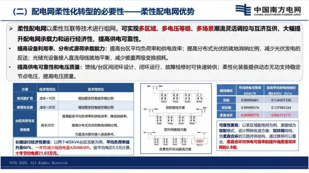 而柔性配电网以柔性互联等技术进行组网,可实现多区域、多电压等级、多场景潮流灵活调控与互济互供,大幅提升配电网承载力和运行经济性,提高供电可靠性。