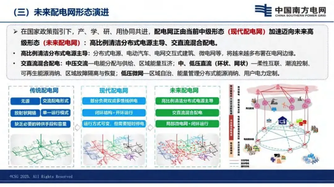 在国家政策指引下,产、学、研、用协同共进,配电网正由当前中级形态加速迈向未来高级形态,即高比例清洁分布式电源主导、交直流混合配电。