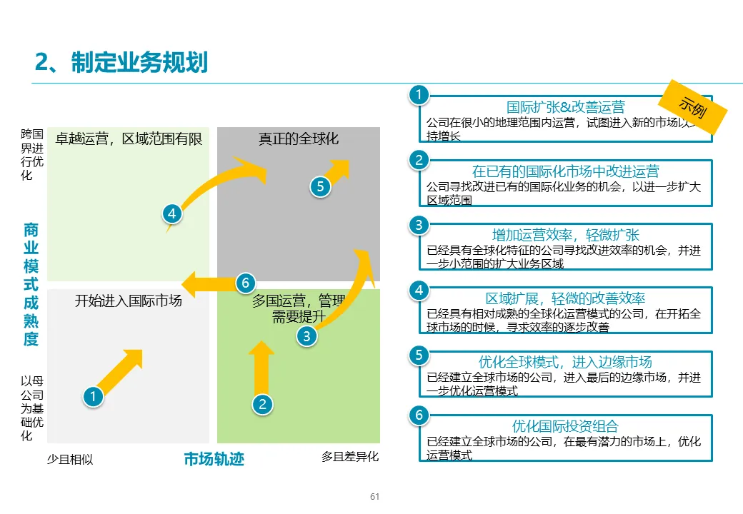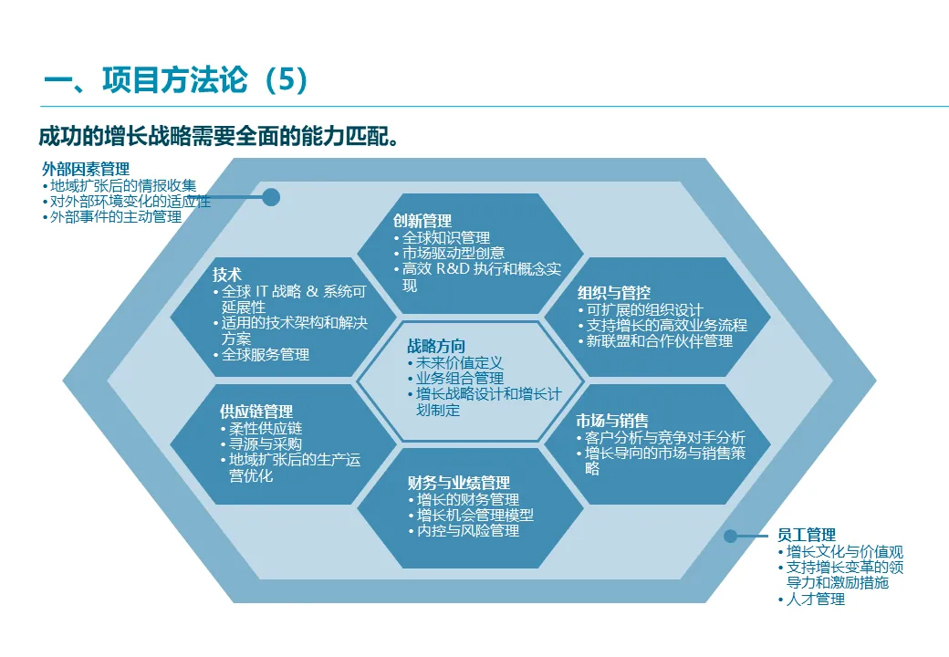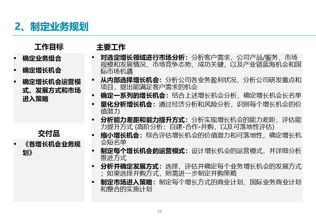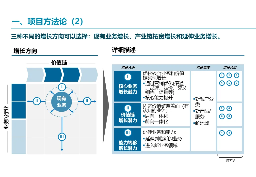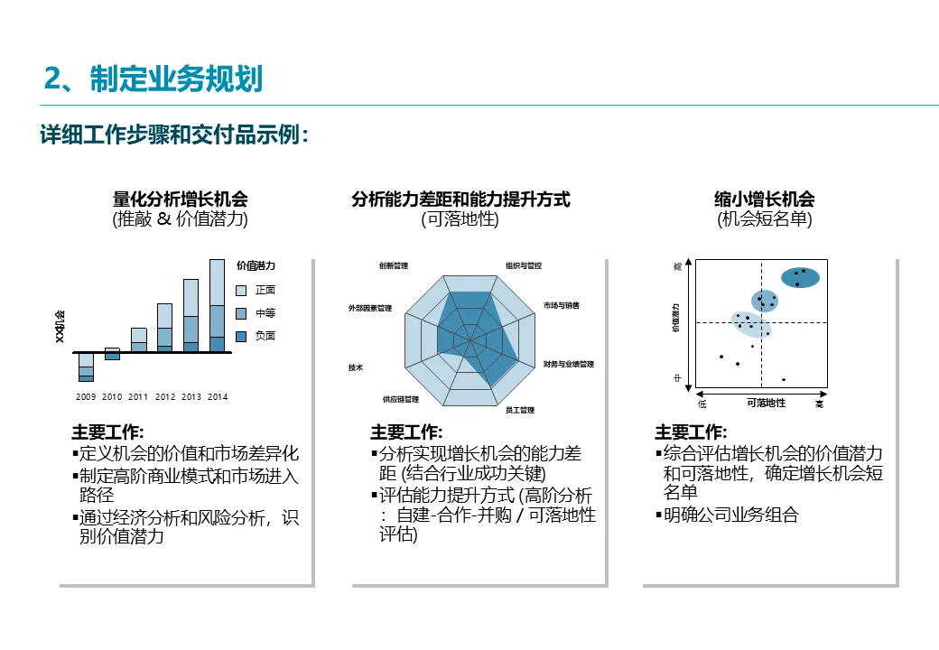 在选定增长领域后,方案进入深度规划阶段。埃森哲将采用 “吸引力-竞争力矩阵” 对现有及新业务进行评估,科学设计公司的未来业务组合,明确各业务的战略角色(核心、发展、孵化)。对于每个关键增长机会(如国际化、新业务),将进行深入的市场量化分析、能力差距评估,并设计具体的运营模式、商业模式(自建、合作或并购)及市场进入策略,确保每个战略方向都有坚实的商业逻辑支撑。