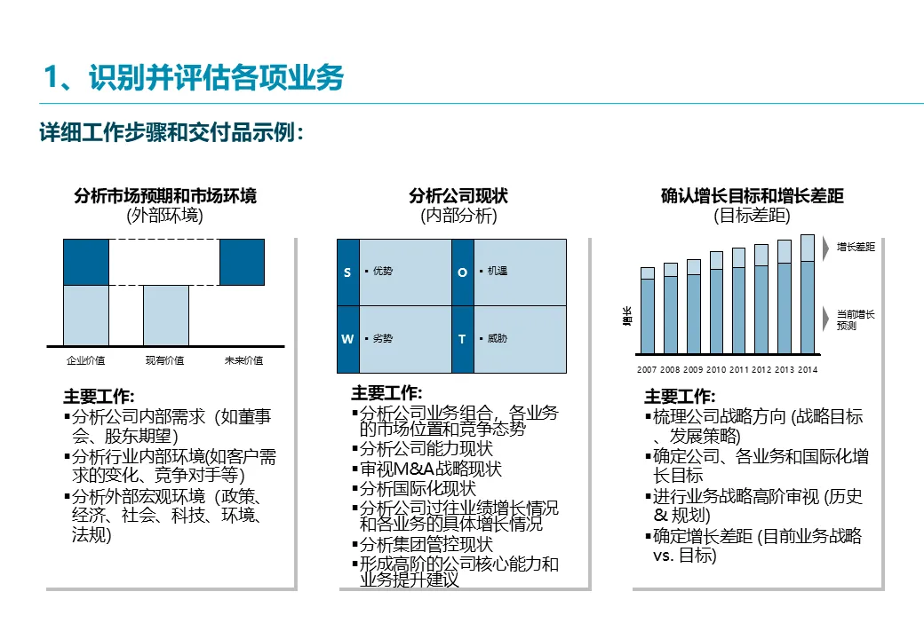 埃某哲提出的核心解决方案并非一份静态的报告,而是一套严谨的、旨在驱动“价值增长”的战略规划方法论与定制化实施流程。其精髓在于,通过四个模块化的专业步骤,将宏观环境、内部能力与增长目标紧密结合,最终输出可执行的战略蓝图与行动路线。