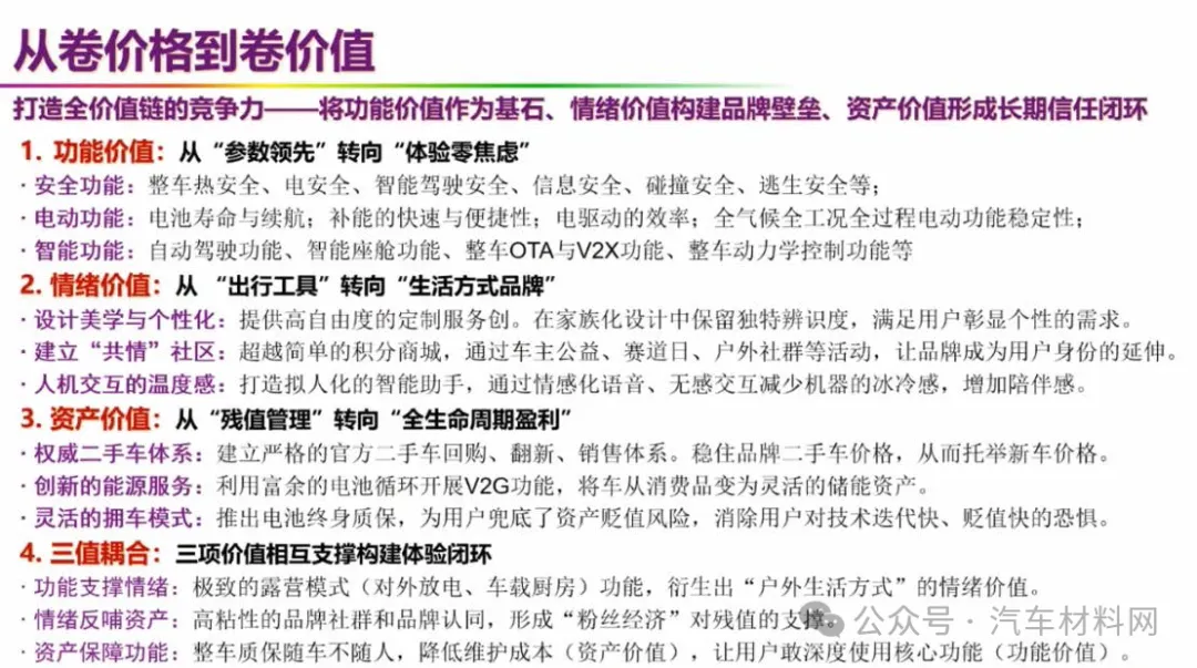 清华大学教授欧阳明高认为,当前新能源汽车市场正实现从“卷价格”向“卷价值”的转变:在功能价值层面,正从“参数领先”转向“体验零焦虑”;在情绪价值层面,从“出行工具”转向“生活方式品牌”;在资产价值层面,从“残值管理”转向“全生命周期”盈利。欧阳明高强调,行业需同等重视这三项价值,推动三者相互支撑、协同发力,构建完善的体验闭环。他预计,随着技术发展,纯电驱动新能源汽车的优势越来越突出,未来将形成以纯电动汽车为主导和车能融合V2G普遍应用的局面。2030年,新能源乘用车将占乘用车新车年销量的70%以上,2035年占比超80%,2040年有望达到85%以上。