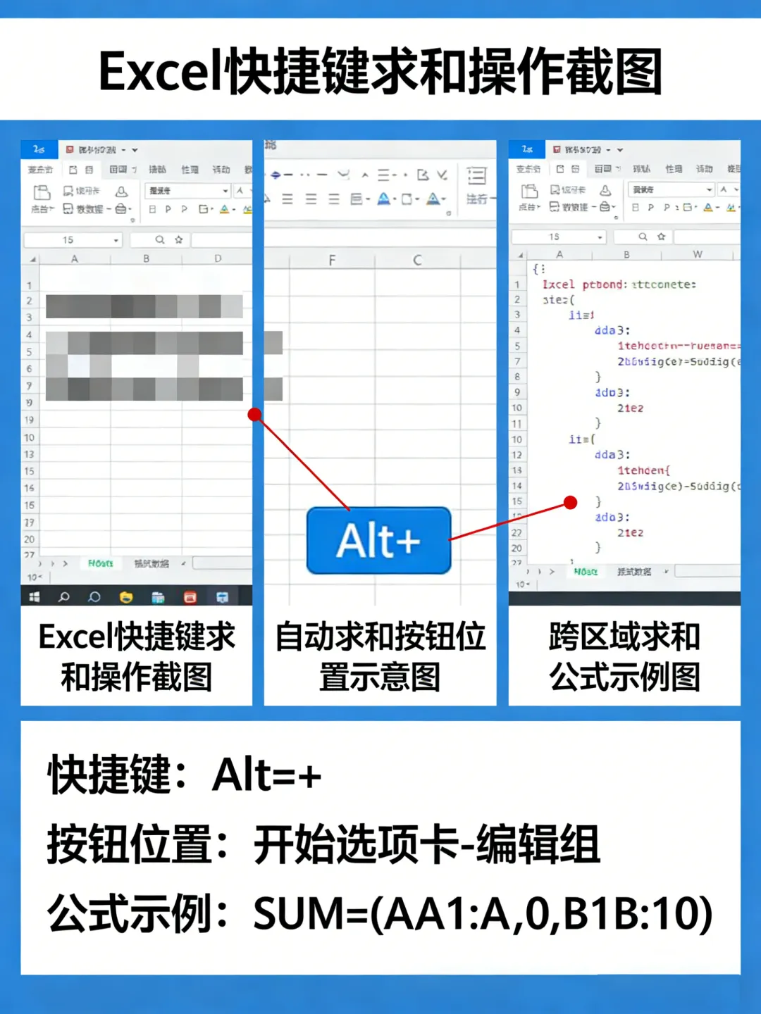 1. 快捷键求和(最常用):选中需要求和的单元格区域,按下“Ctrl+Shift+=”,瞬间得出求和结果,适合连续区域求和(如一列、一行数据);