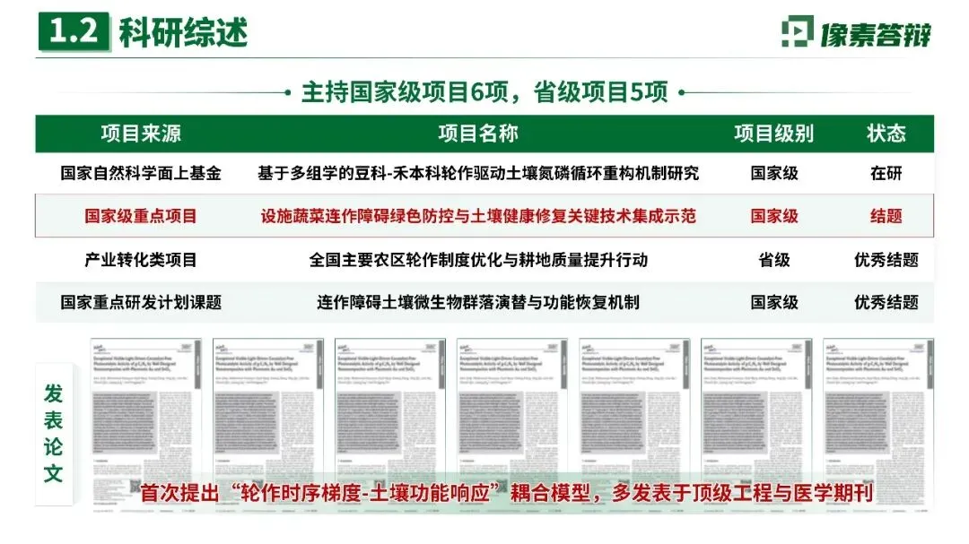 主色调绿色 + 深色,贴合土壤、农业、生态主题,视觉专业且沉稳。版式左右 / 上下对称,图文比例均衡,无杂乱排版,保持高校 / 科研院所正式风格。图表、证书、数据页格式统一,字体、字号、对齐方式全程一致。