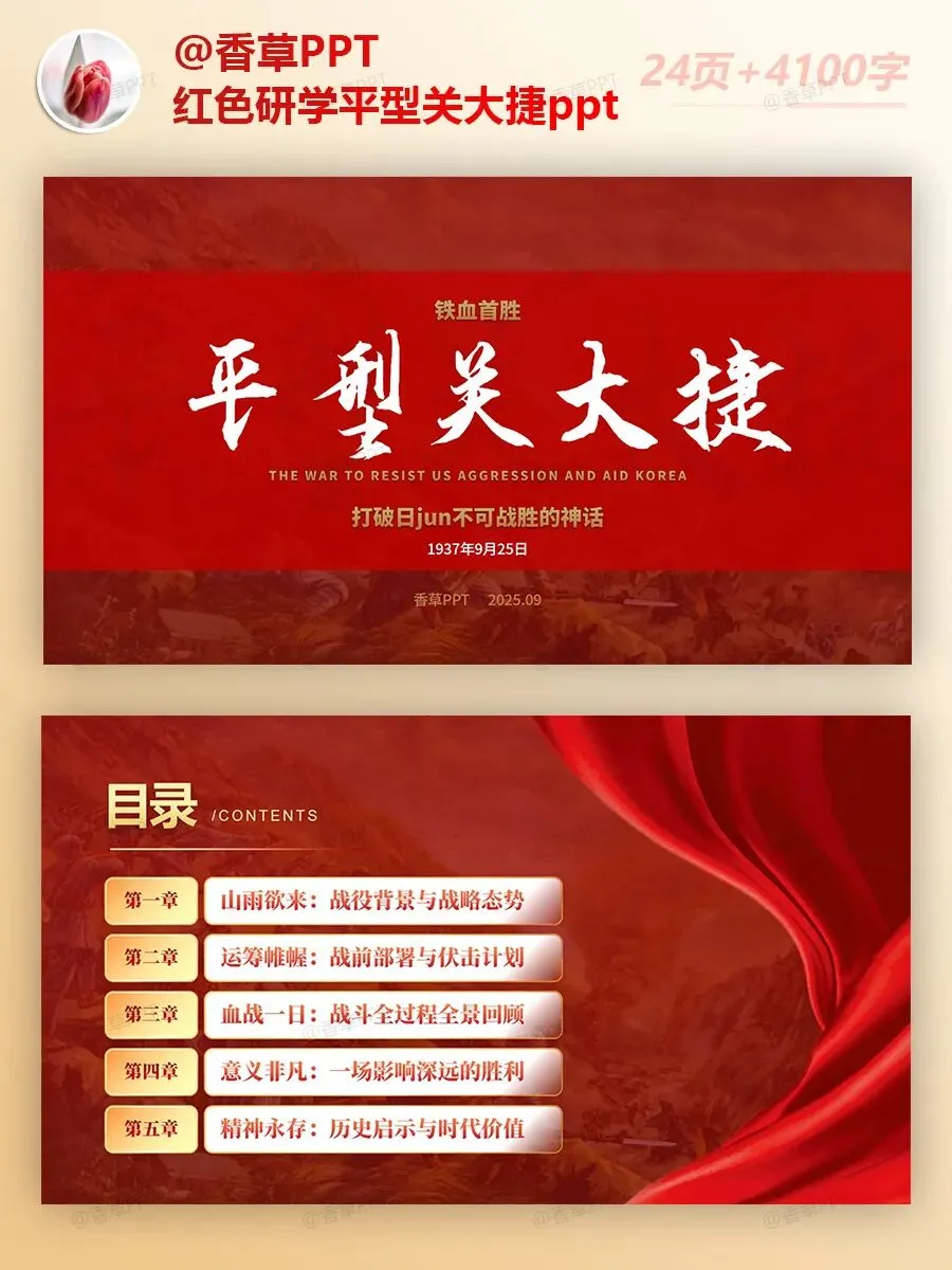 红色研学之平型关大捷PPT分享,共24页,文字稿4100字,图文均可编辑修改
