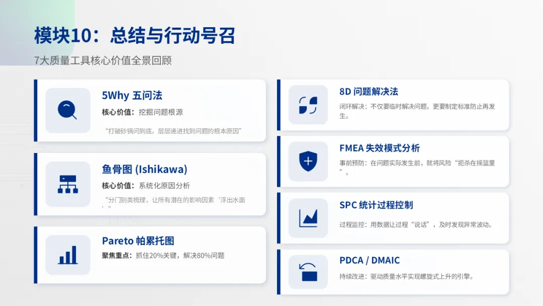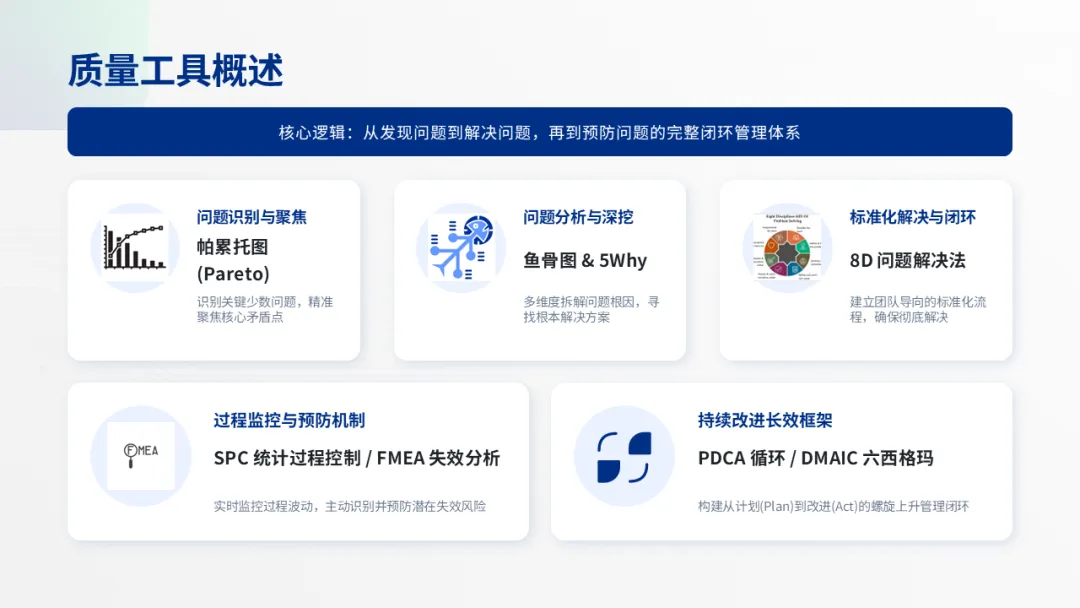 这些工具不是孤立的,而是可以相互组合使用,覆盖了从“发现问题 → 分析根因 → 制定对策 → 预防再发生”的全流程。